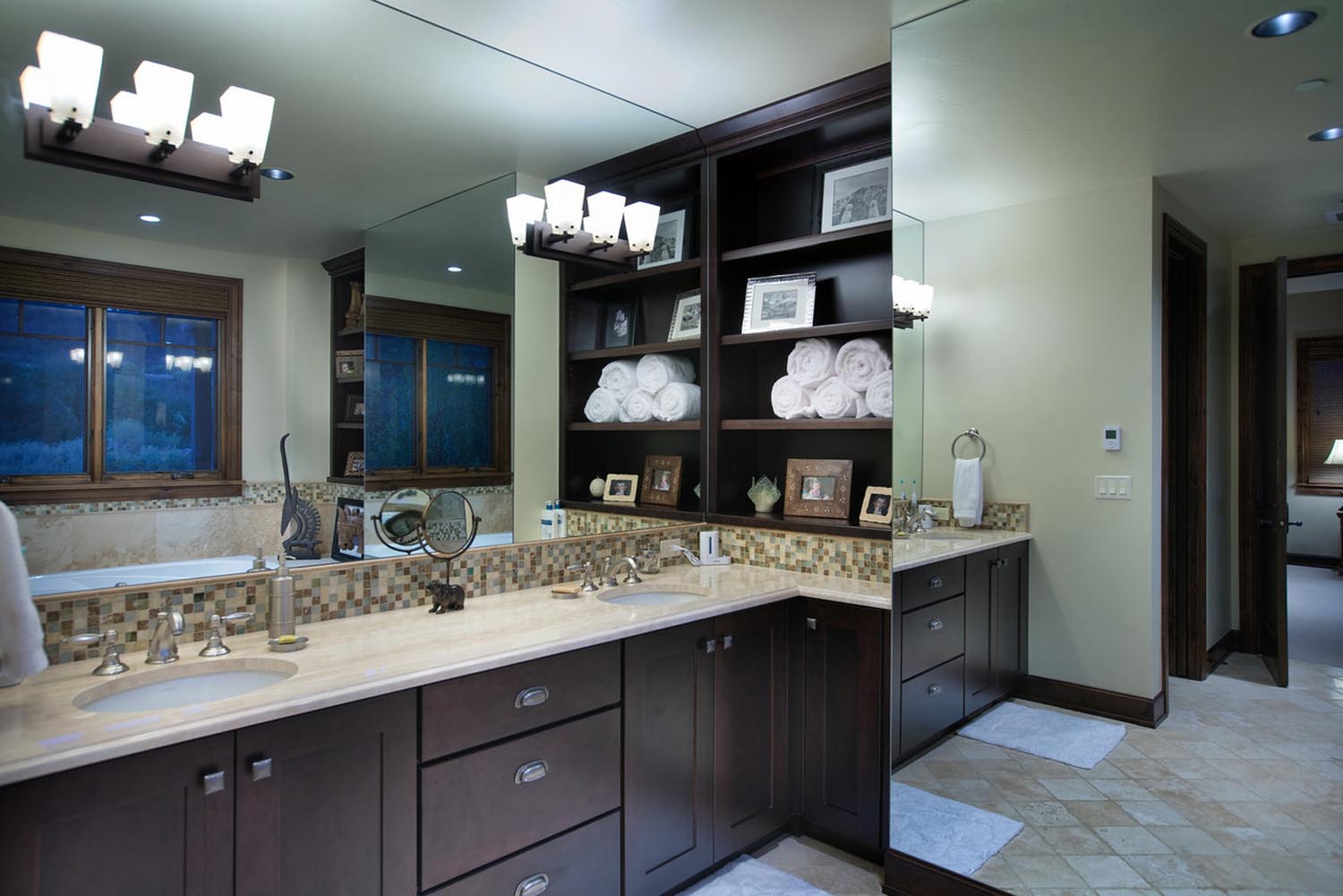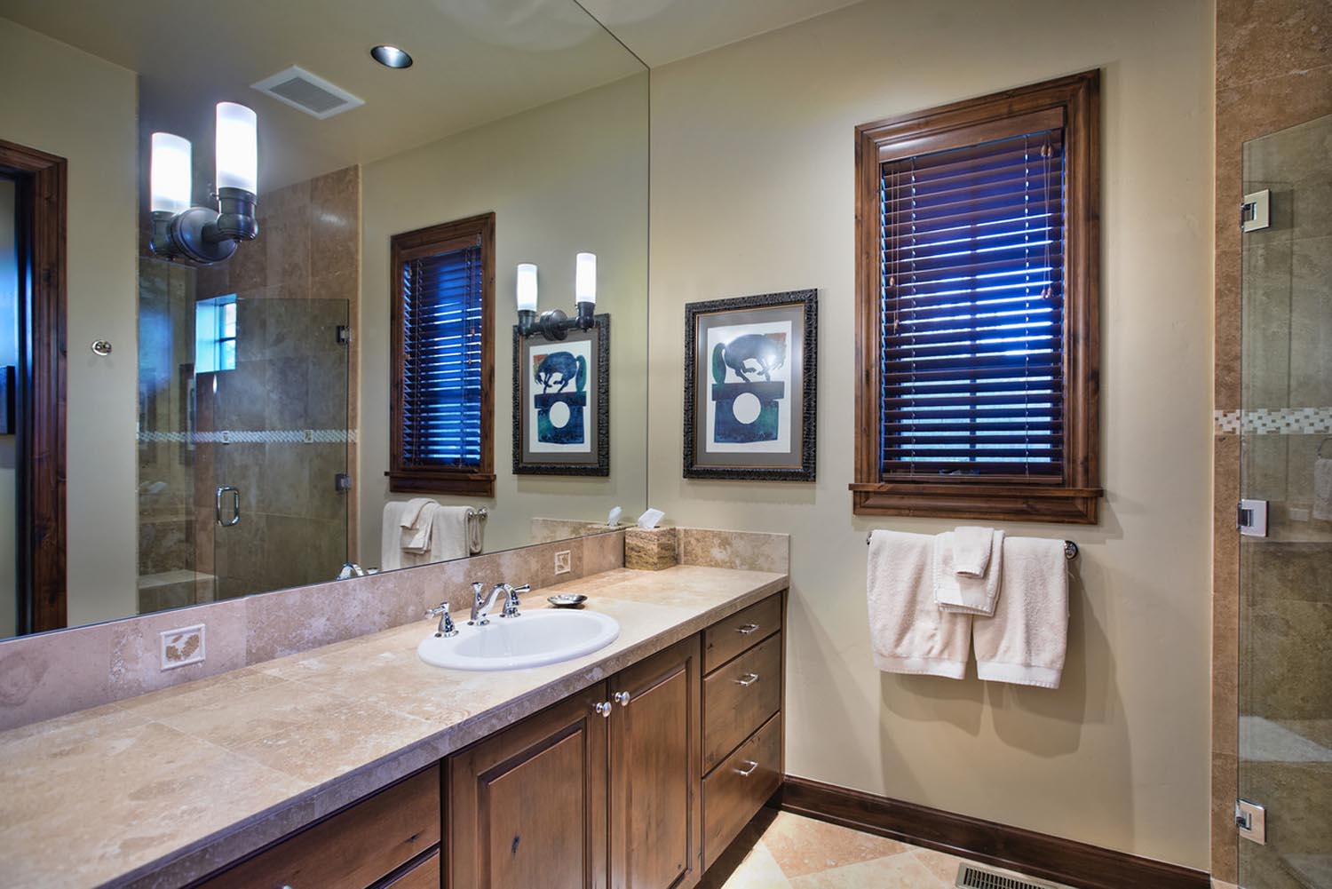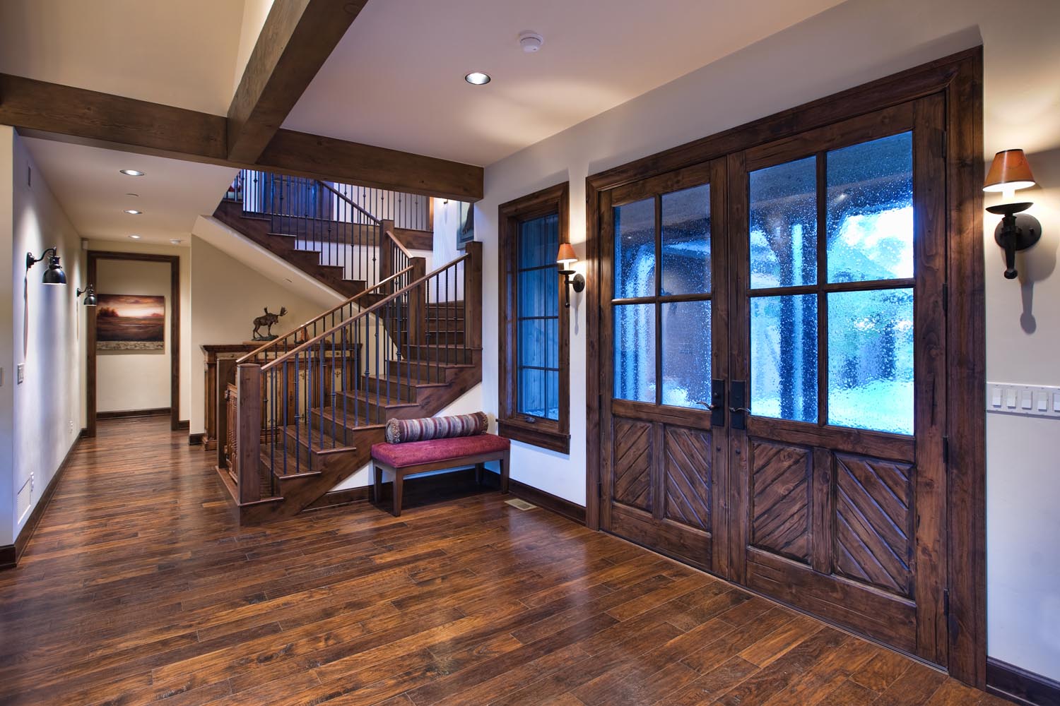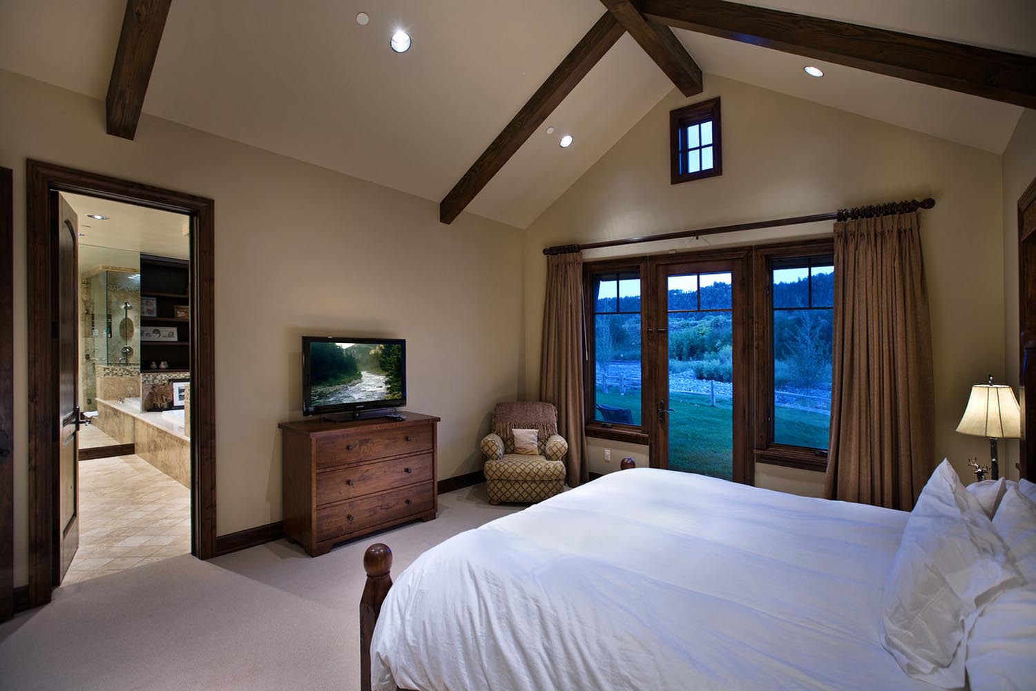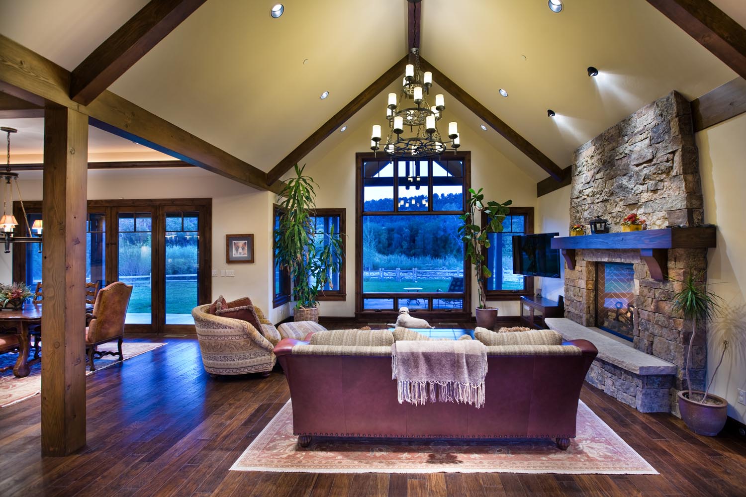 - This 5,000 sq. ft. riverfront residence offers a warm and spacious haven for a growing family. Dark wood floors and exposed wood beams infuse the space with rustic charm, while cream walls provide a timeless backdrop for family gatherings. Subtle burgundy accents and natural stone/tile elements add depth and character to the interior, creating a welcoming atmosphere that seamlessly blends tradition with modern comfort.