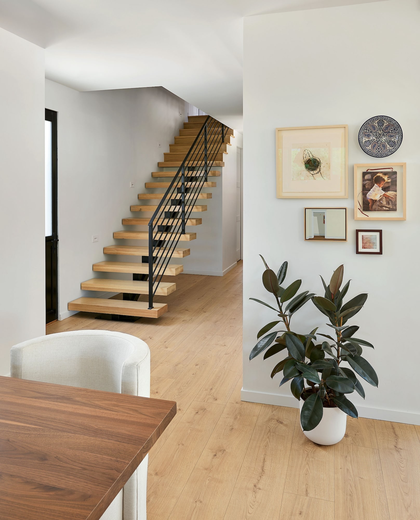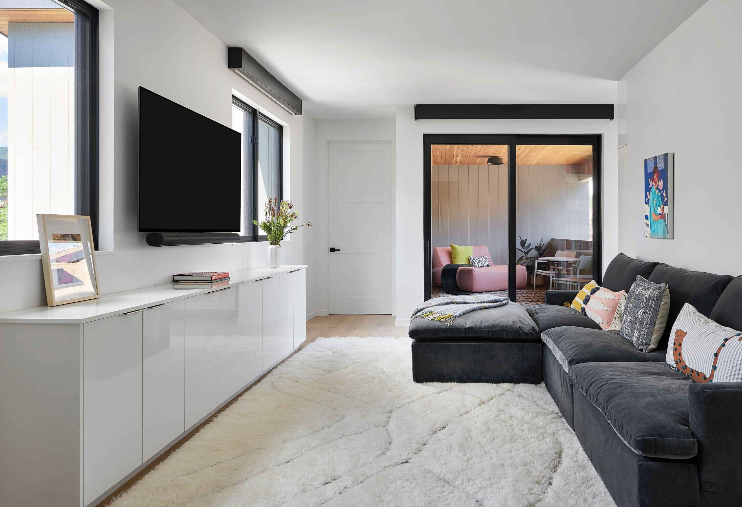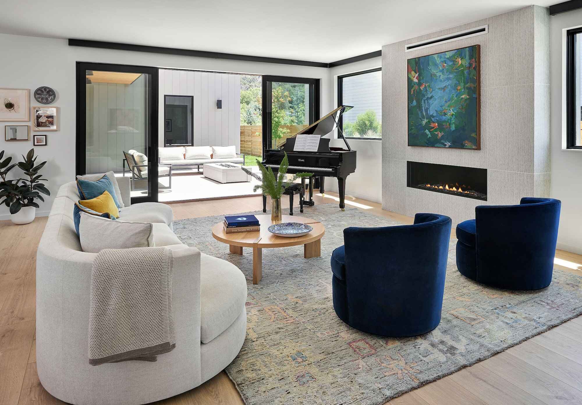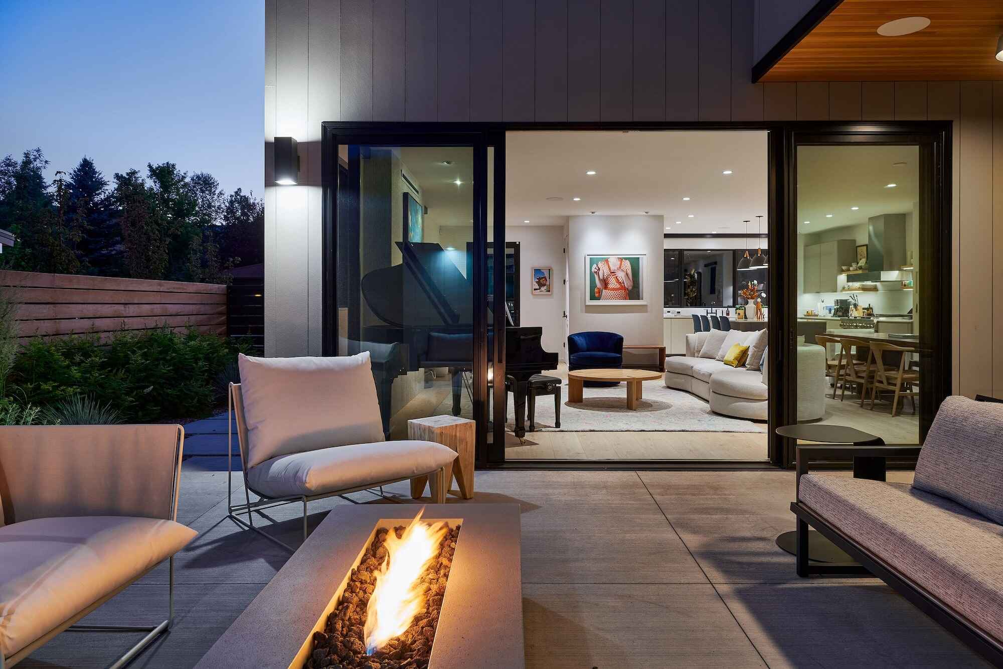 - This single-family residence centers its social spaces with clean lines and intuitive design. It flows cleanly from the glass front door to the back courtyard, featuring a custom fire pit and expansive patio space. Sliding doors and a balcony welcome in sunlight, and its crisp white walls add to the airy feeling of the open living-dining room space. Floating stairs contribute to its contemporary vibe, tempered by the welcoming warm woods found throughout the home.