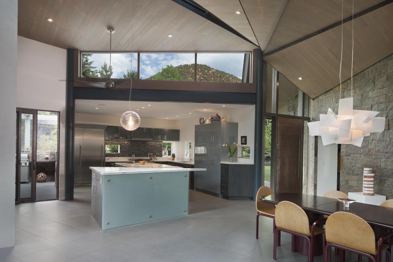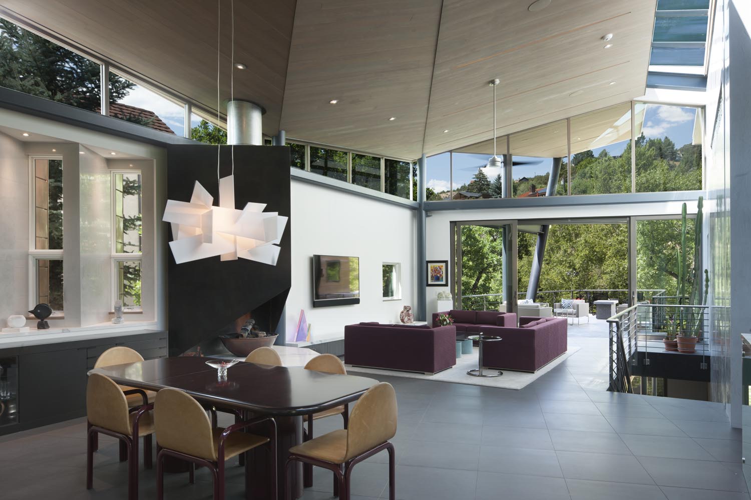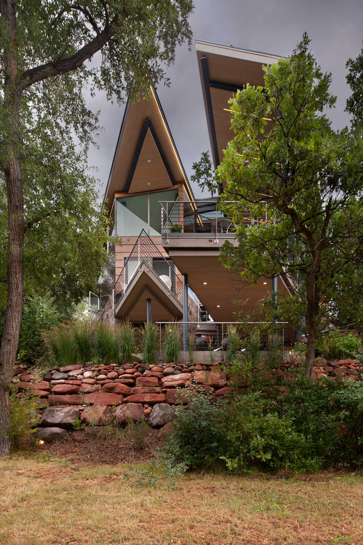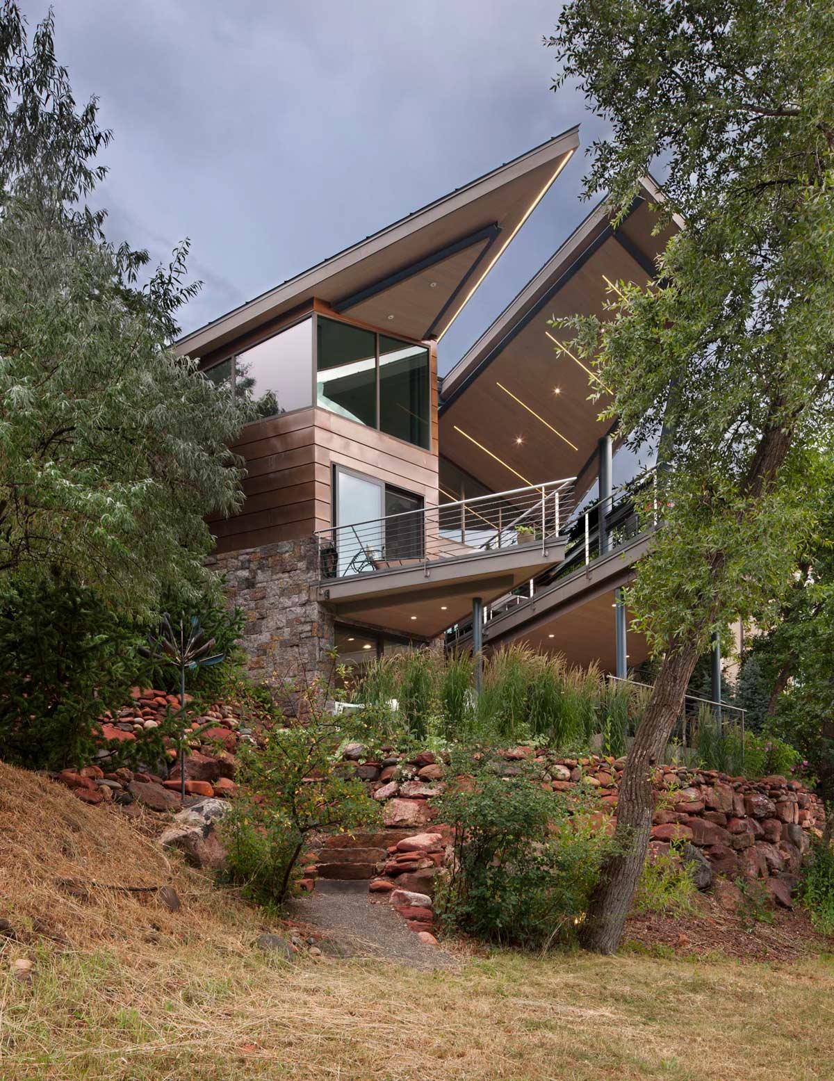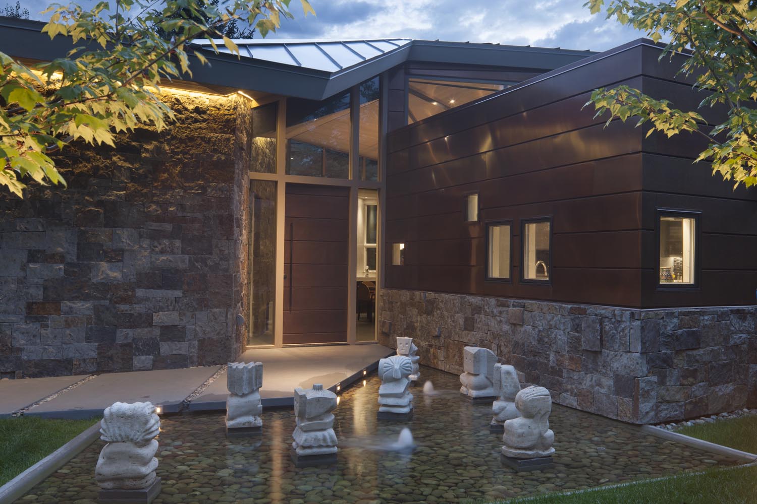 - This angular home stands majestically on a hill, surrounded by trees, with an exterior adorned in natural browns, stone, and expansive windows. The overhanging roof with modern lighting adds to its striking appearance. Inside, the minimalist design features modern, simple furniture, bold light fixtures, and a natural color palette of white, black, browns, and burgundies. Outdoor elements such as stone and a water feature with small statues seamlessly integrate the home with its natural surroundings.