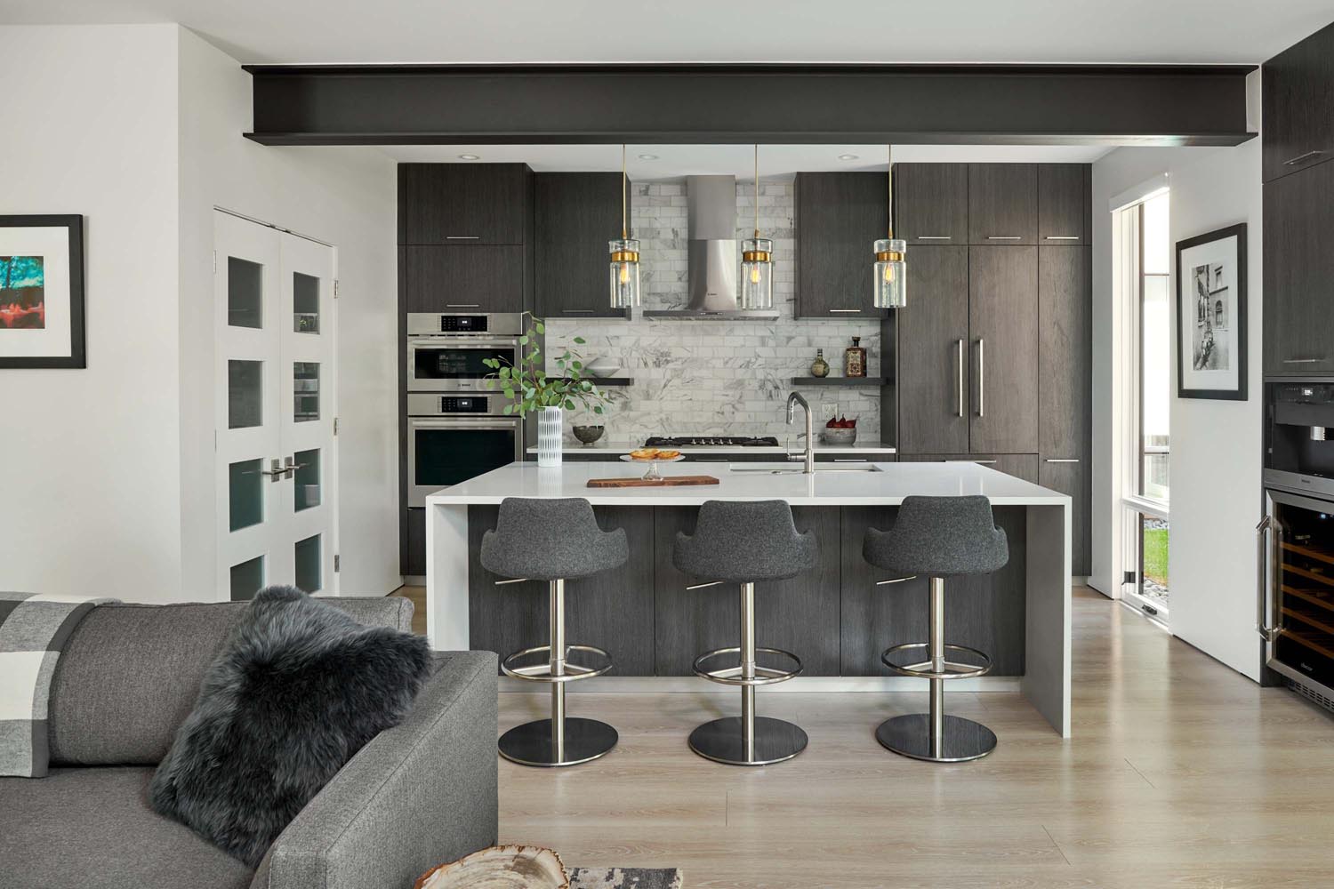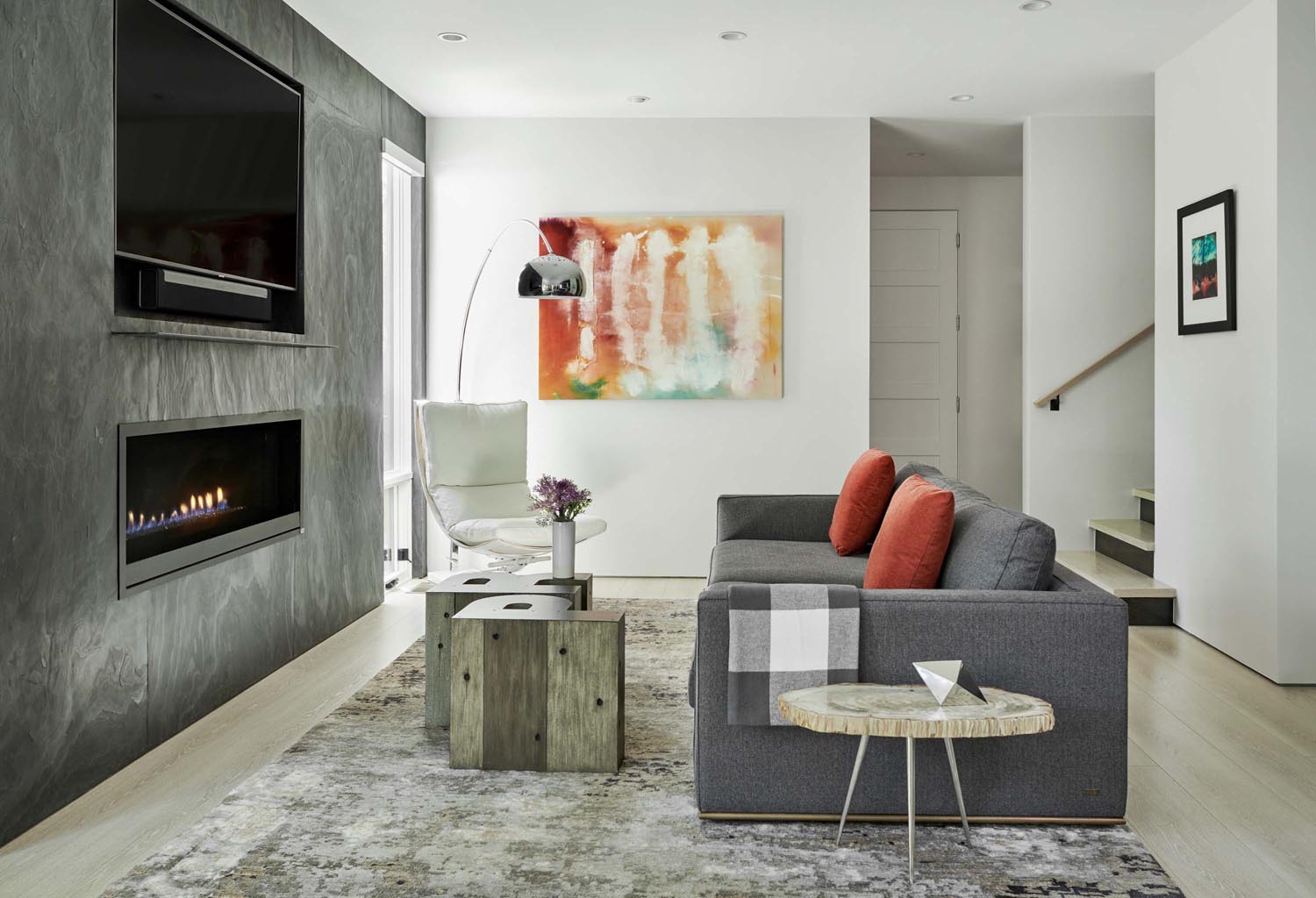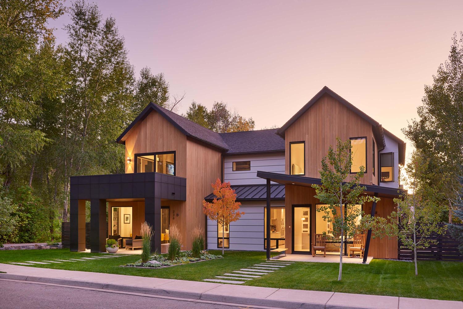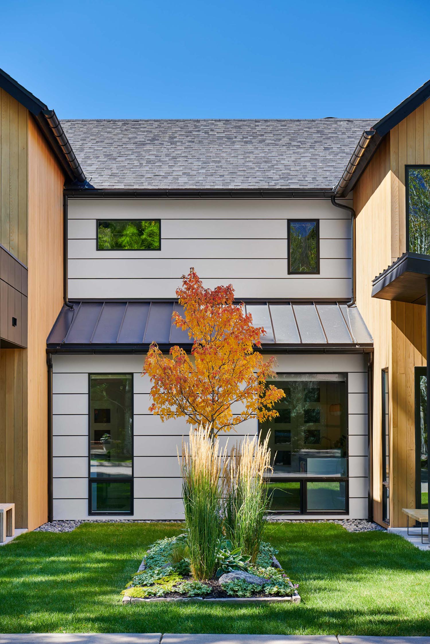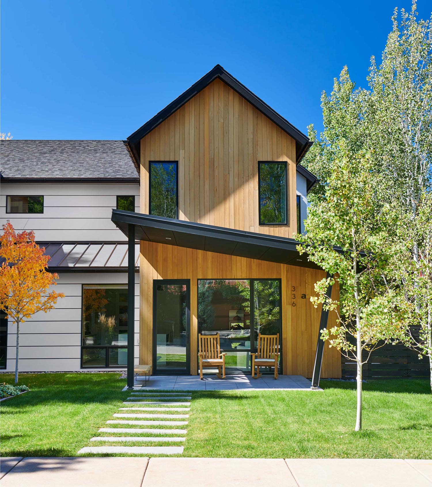 - This duplex showcases a distinctive blend of modern design and natural materials. The exterior features a harmonious combination of wood, white siding, and striking black overhangs adding a dynamic architectural interest. Inside, the white walls create a bright and spacious feel, contrasted by dark grey and stone-colored accents that provide depth and sophistication. Pops of color strategically placed throughout the interior infuse vibrancy and personality into the living spaces, making this home a stylish and contemporary haven with a balanced, cohesive aesthetic.
