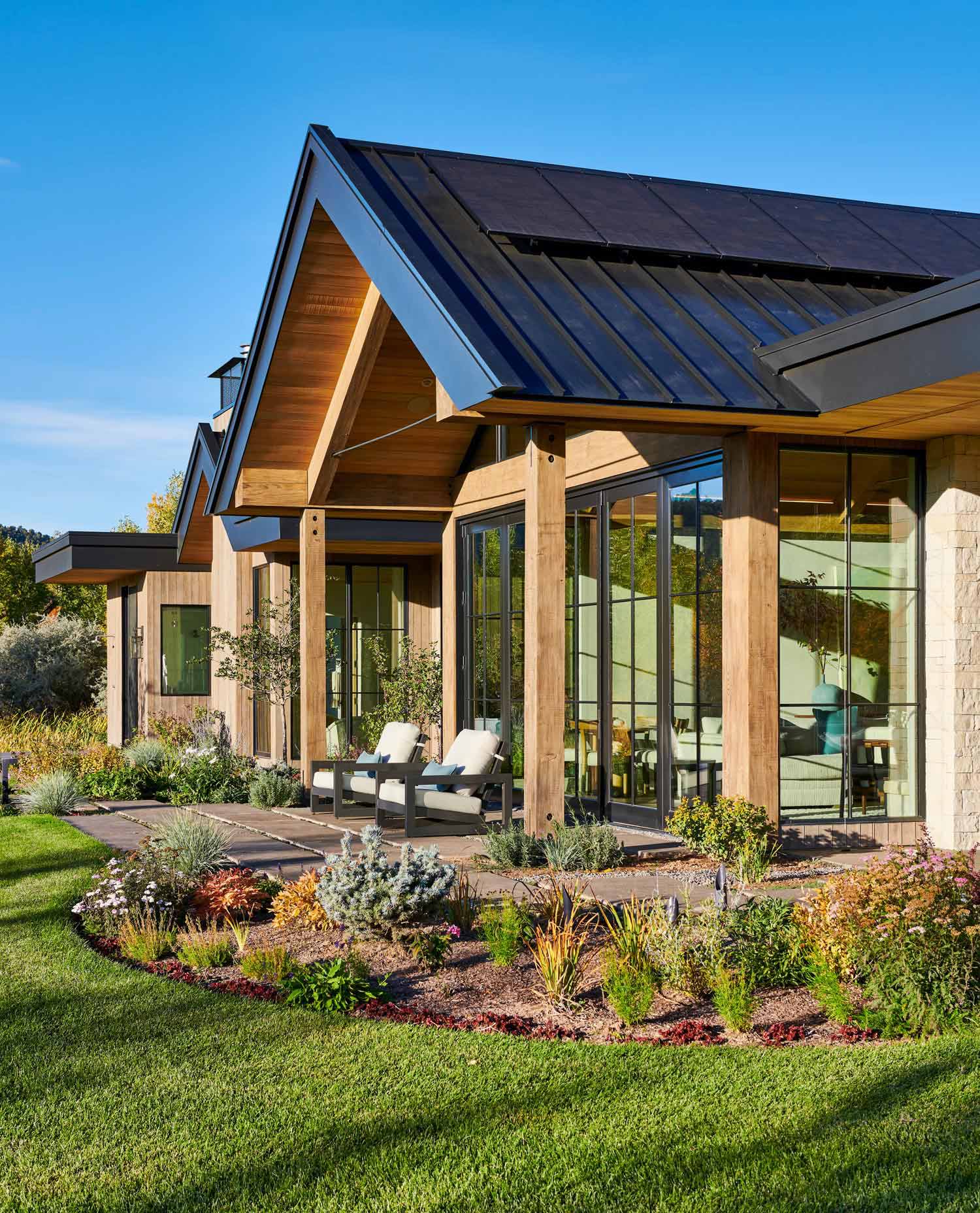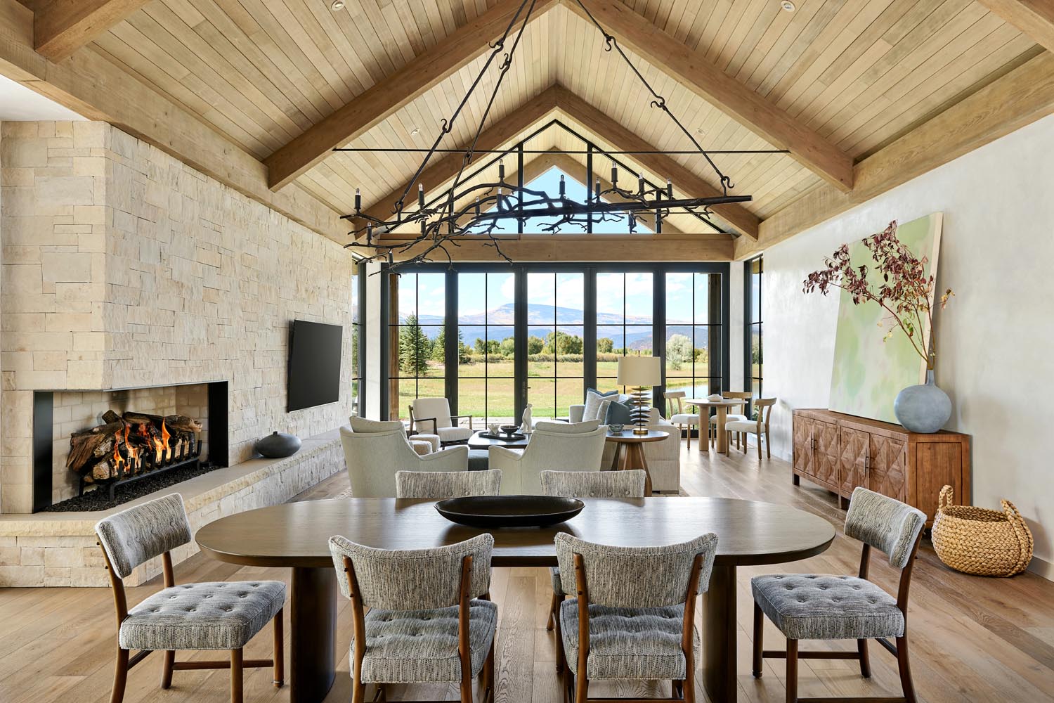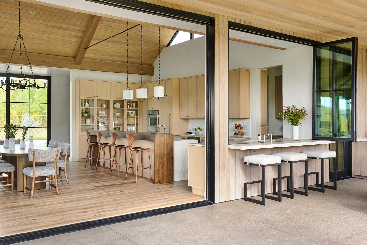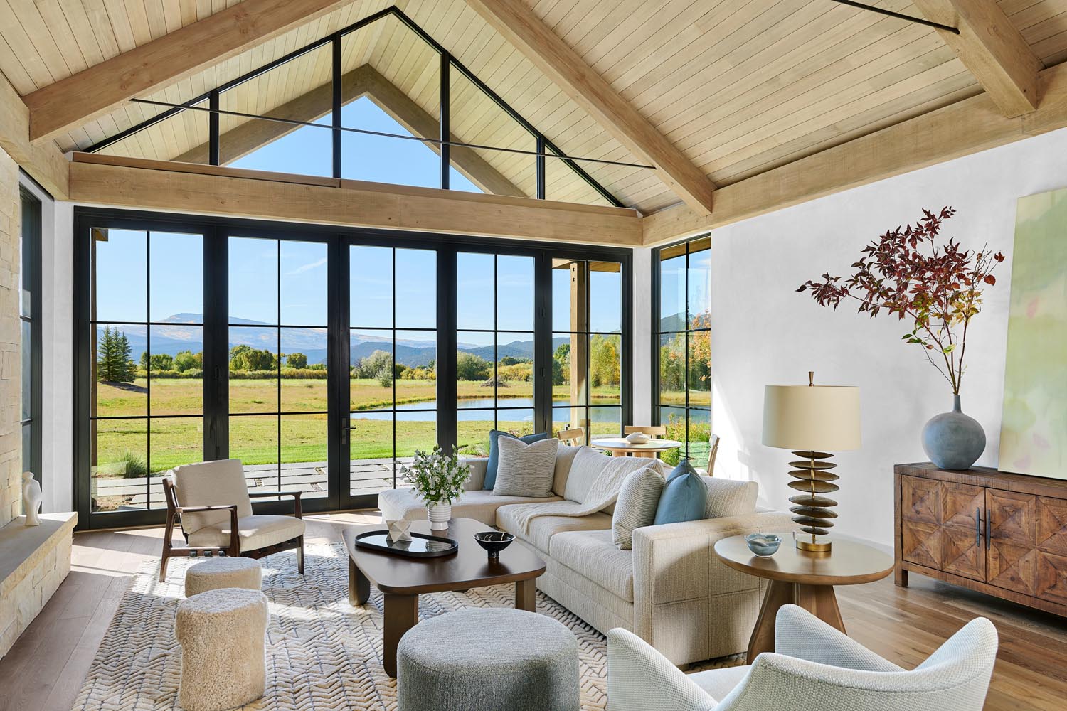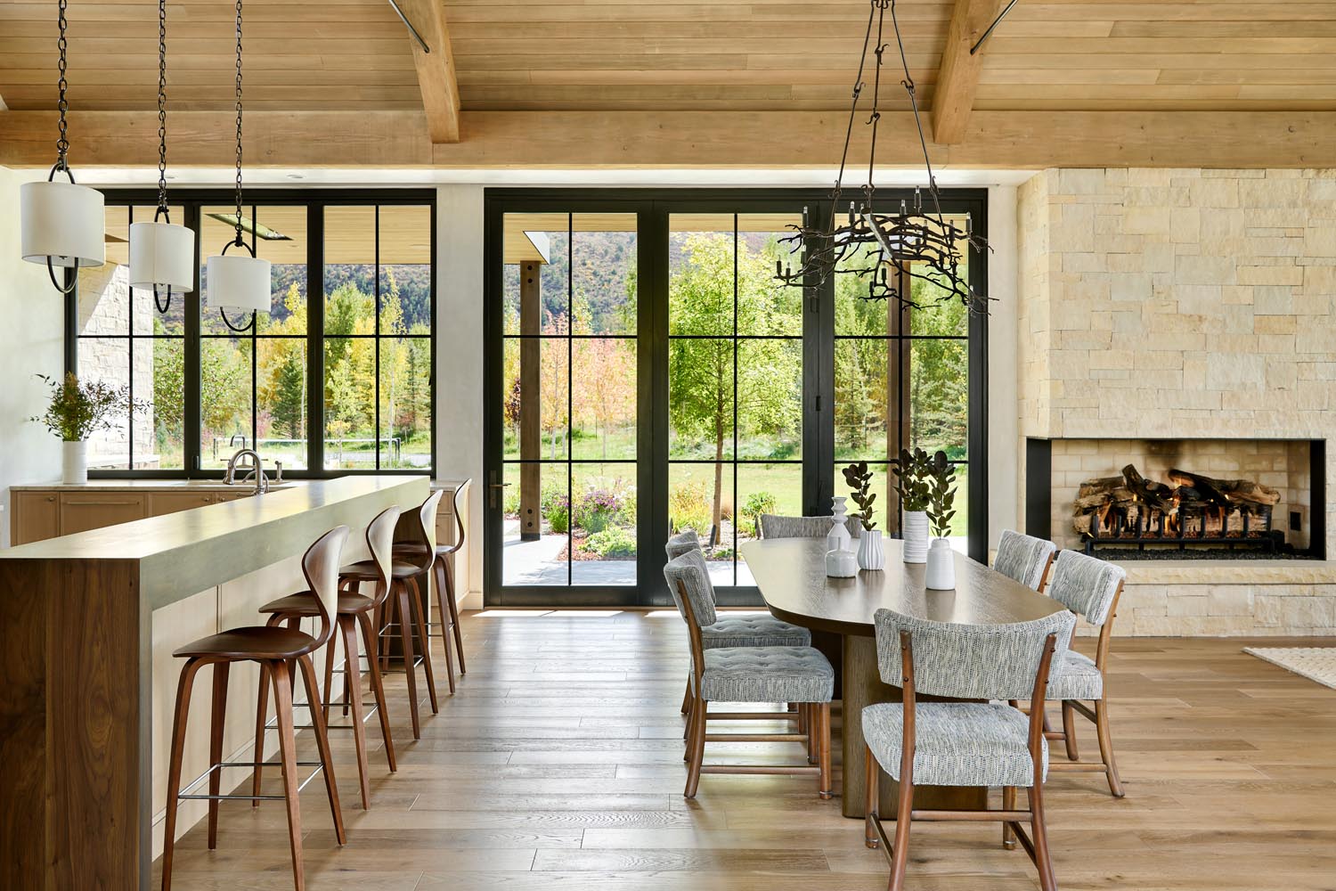 - The home beautifully combines modern and rustic elements, with natural wood and stone showcased throughout. Large, expansive windows and doors seamlessly blend the interior with the exterior, creating a harmonious connection with nature. Inside, reclaimed wood barn accents add rustic charm, while small pops of color—such as blue sofas, green furniture, and green tiles—bring the vibrant outdoors inside.