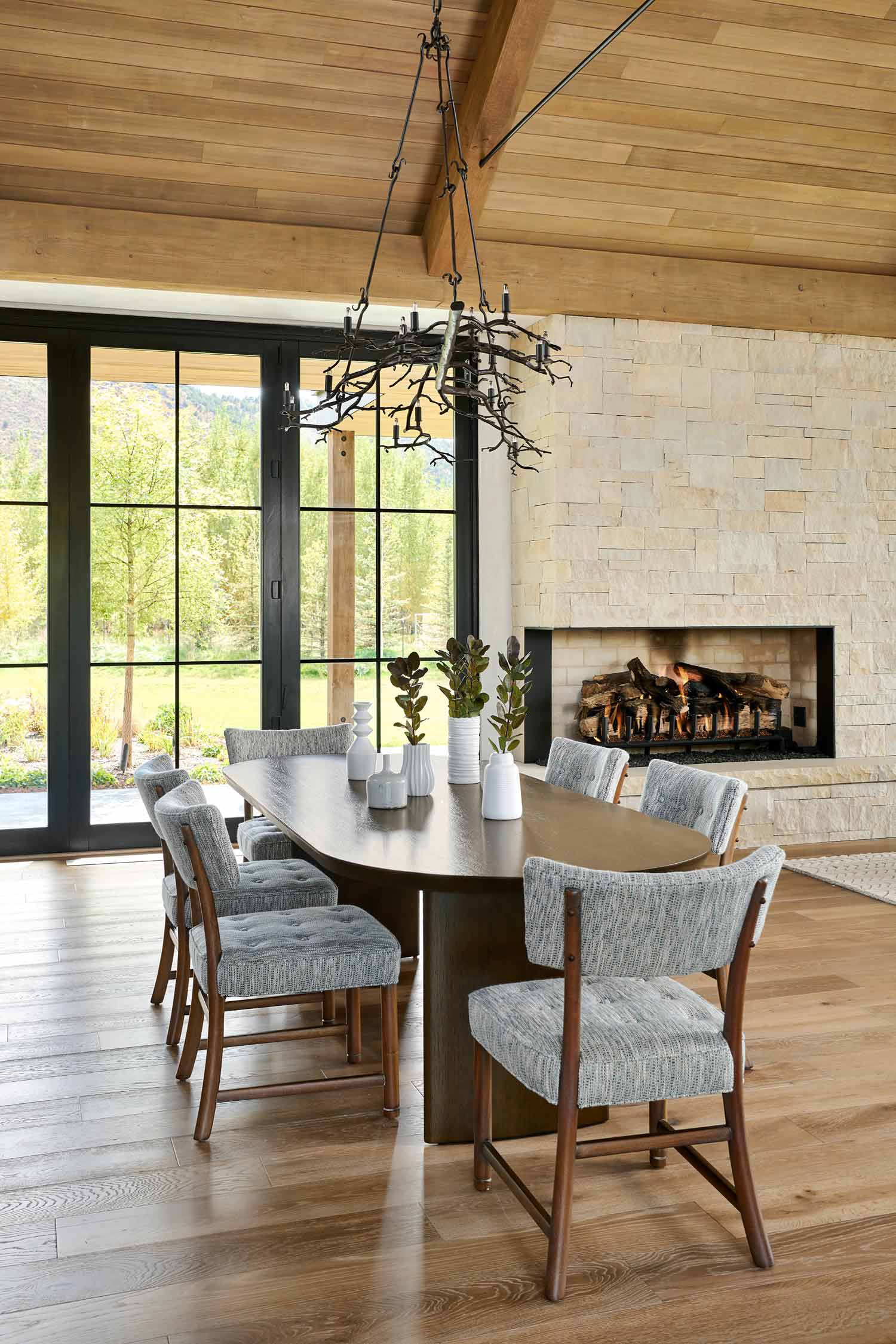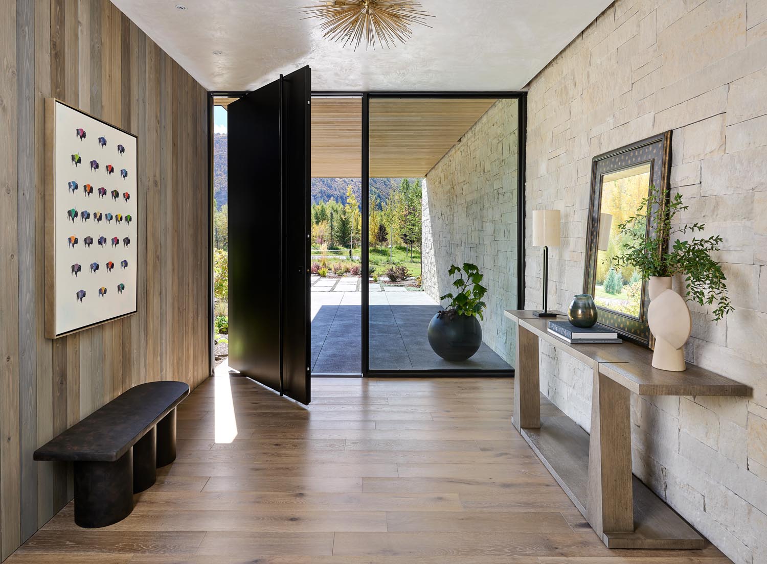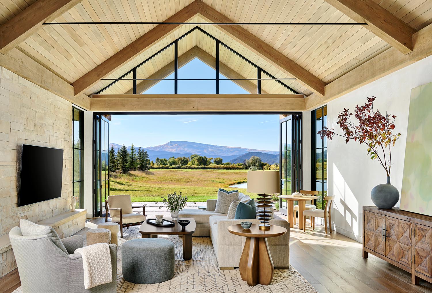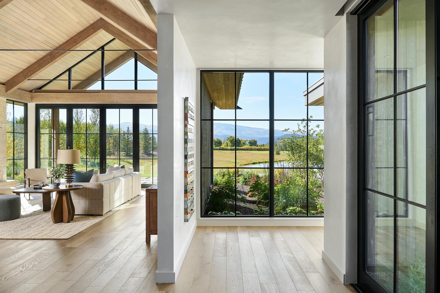 - The home beautifully combines modern and rustic elements, with natural wood and stone showcased throughout. Large, expansive windows and doors seamlessly blend the interior with the exterior, creating a harmonious connection with nature. Inside, reclaimed wood barn accents add rustic charm, while small pops of color—such as blue sofas, green furniture, and green tiles—bring the vibrant outdoors inside.