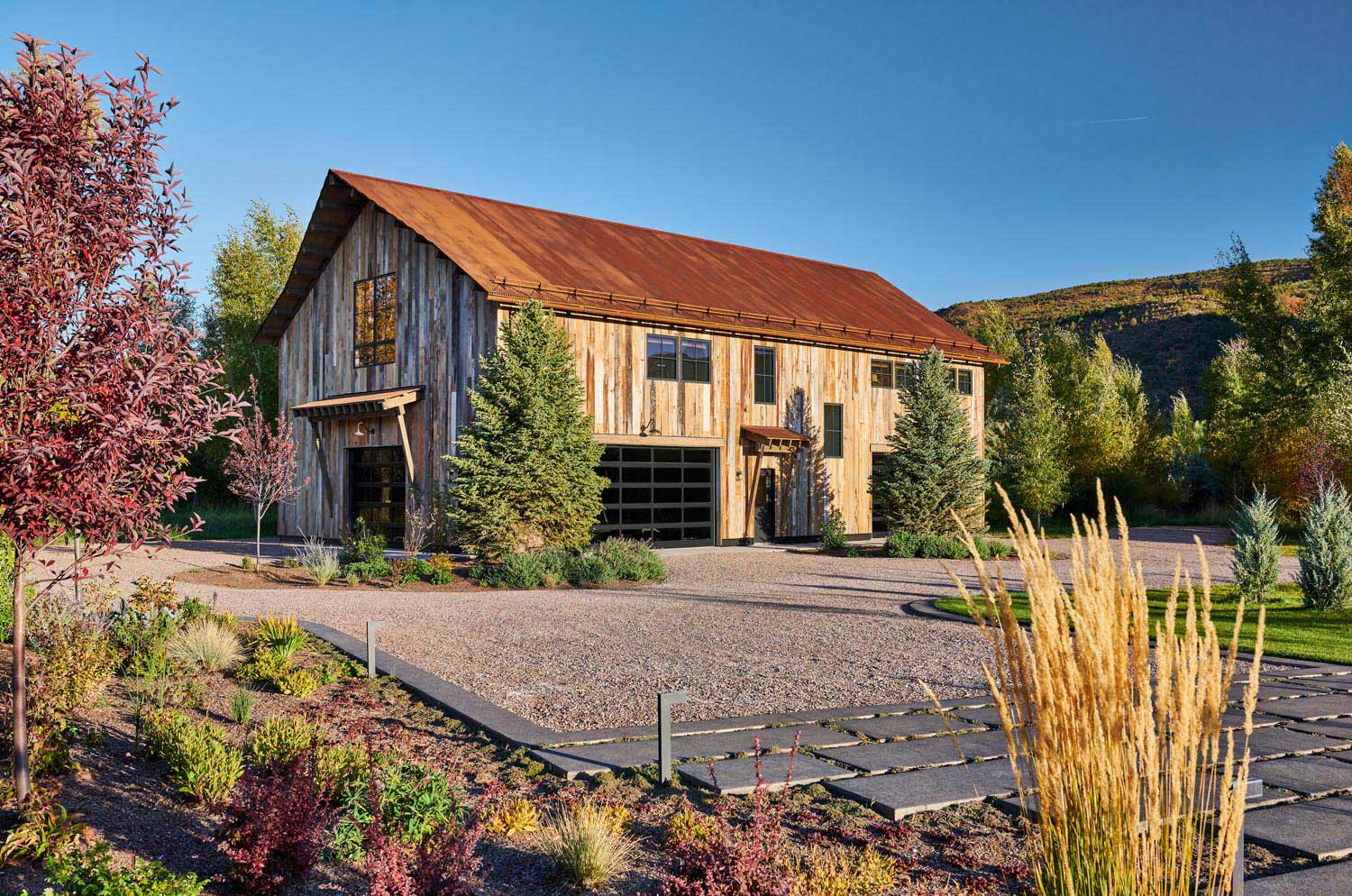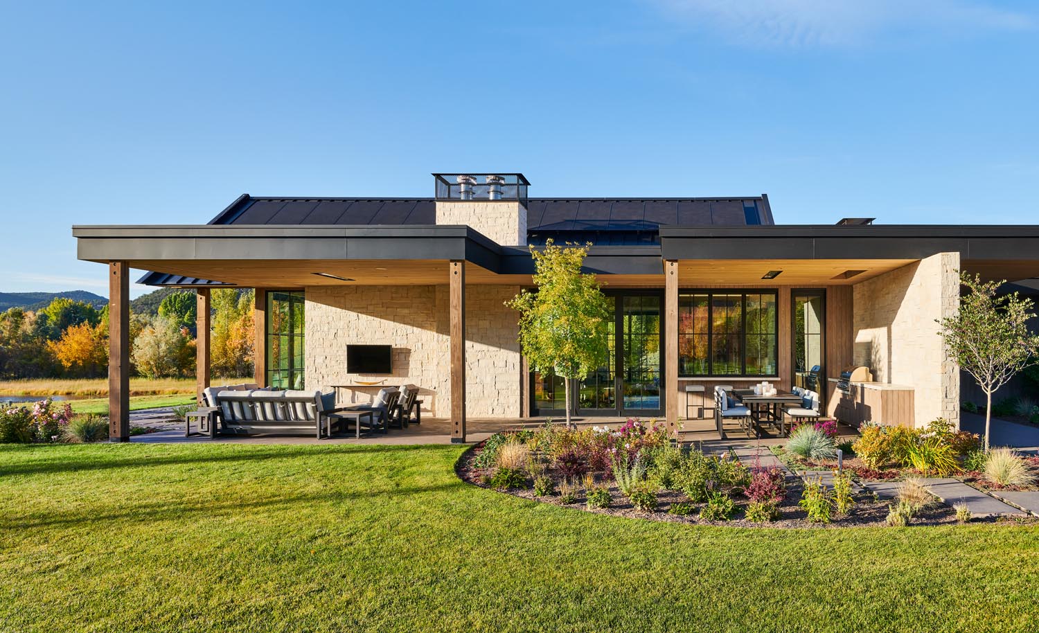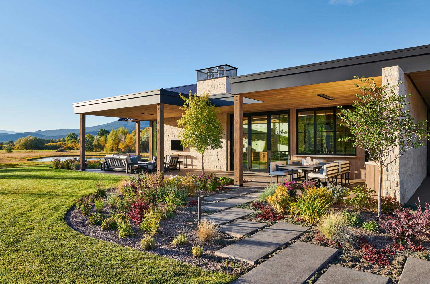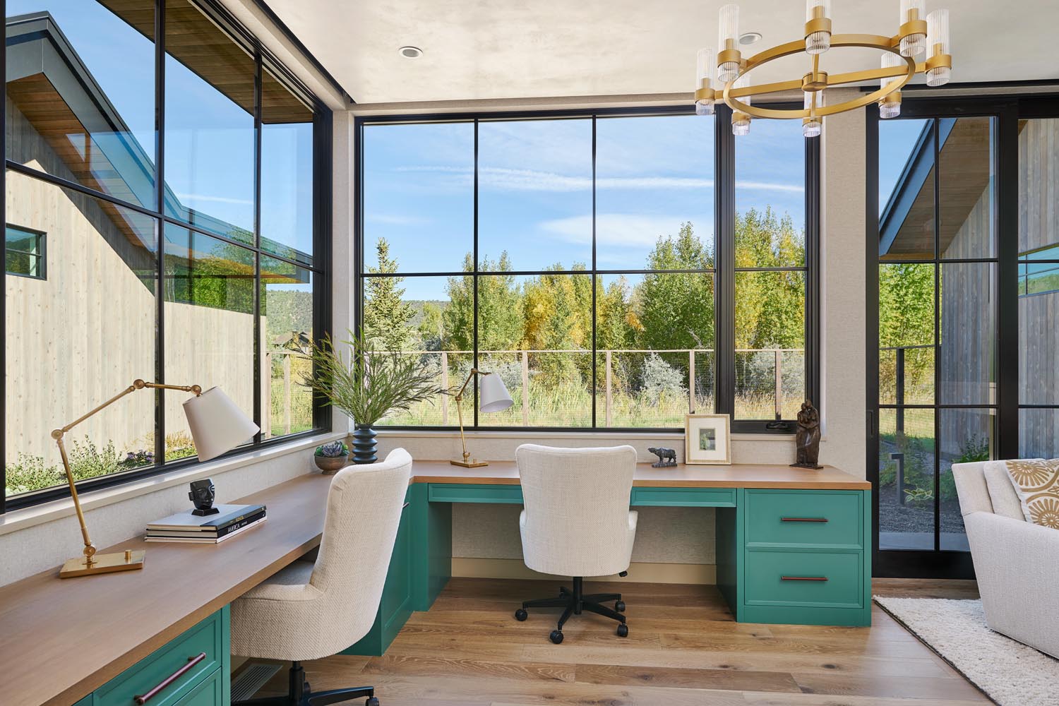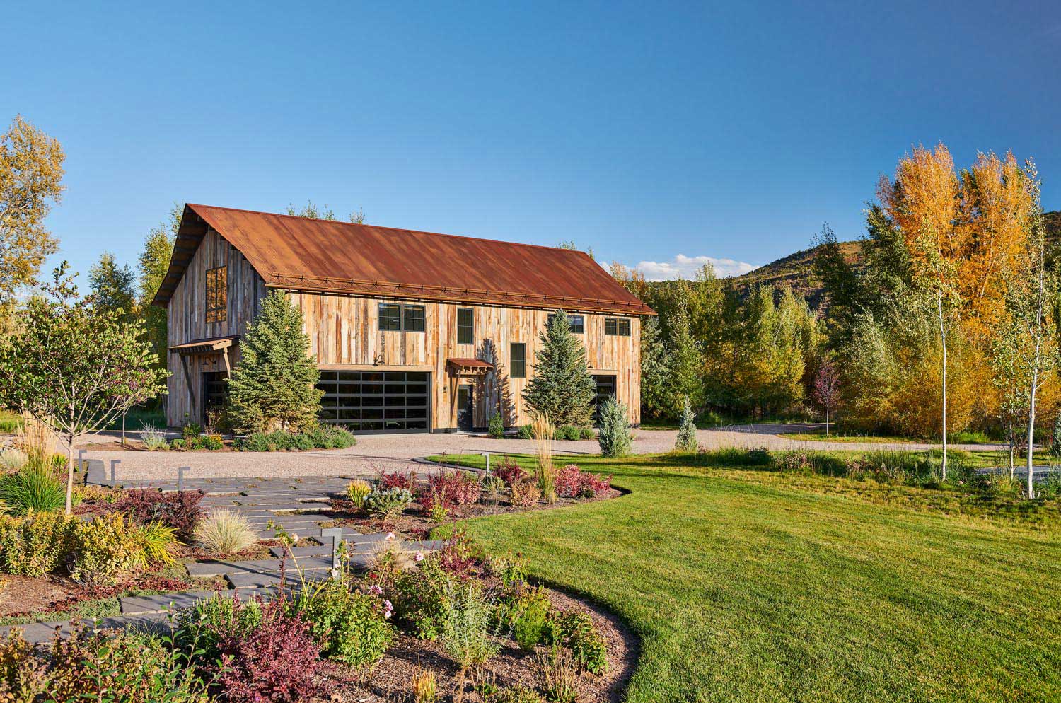 - The home beautifully combines modern and rustic elements, with natural wood and stone showcased throughout. Large, expansive windows and doors seamlessly blend the interior with the exterior, creating a harmonious connection with nature. Inside, reclaimed wood barn accents add rustic charm, while small pops of color—such as blue sofas, green furniture, and green tiles—bring the vibrant outdoors inside.