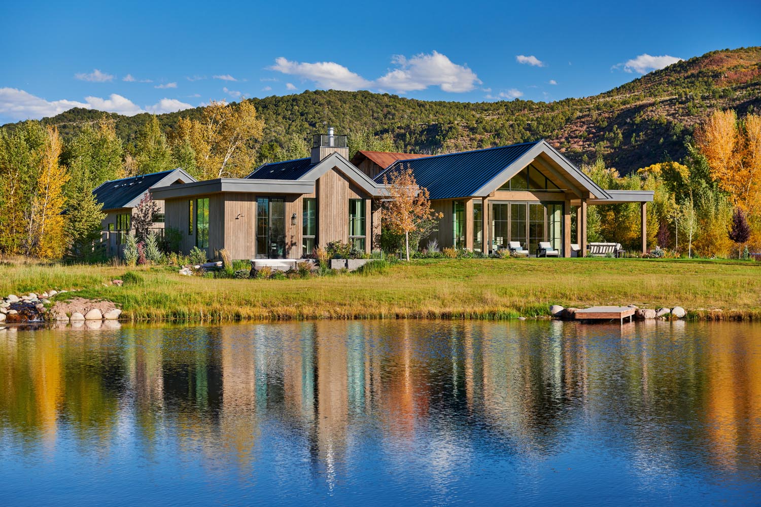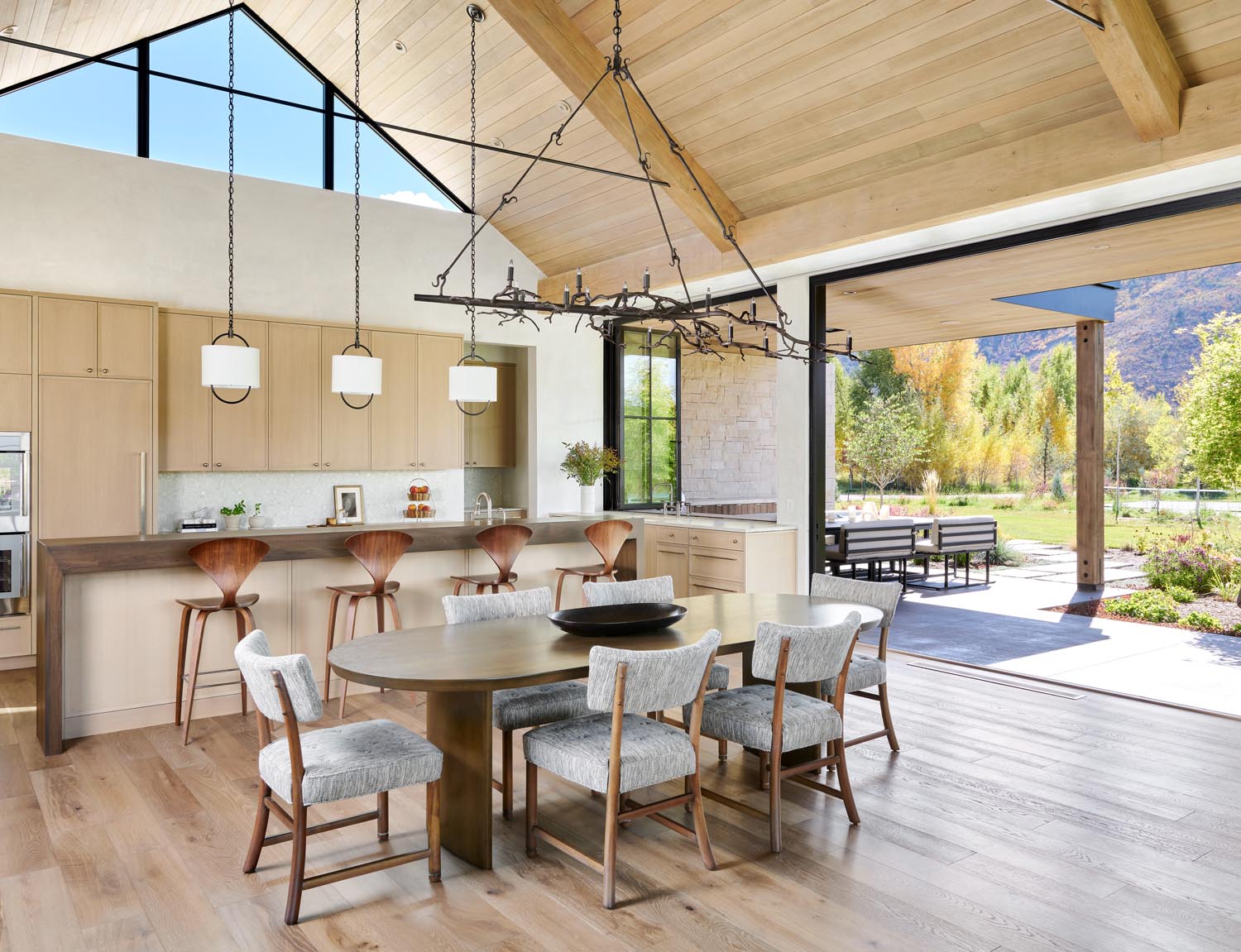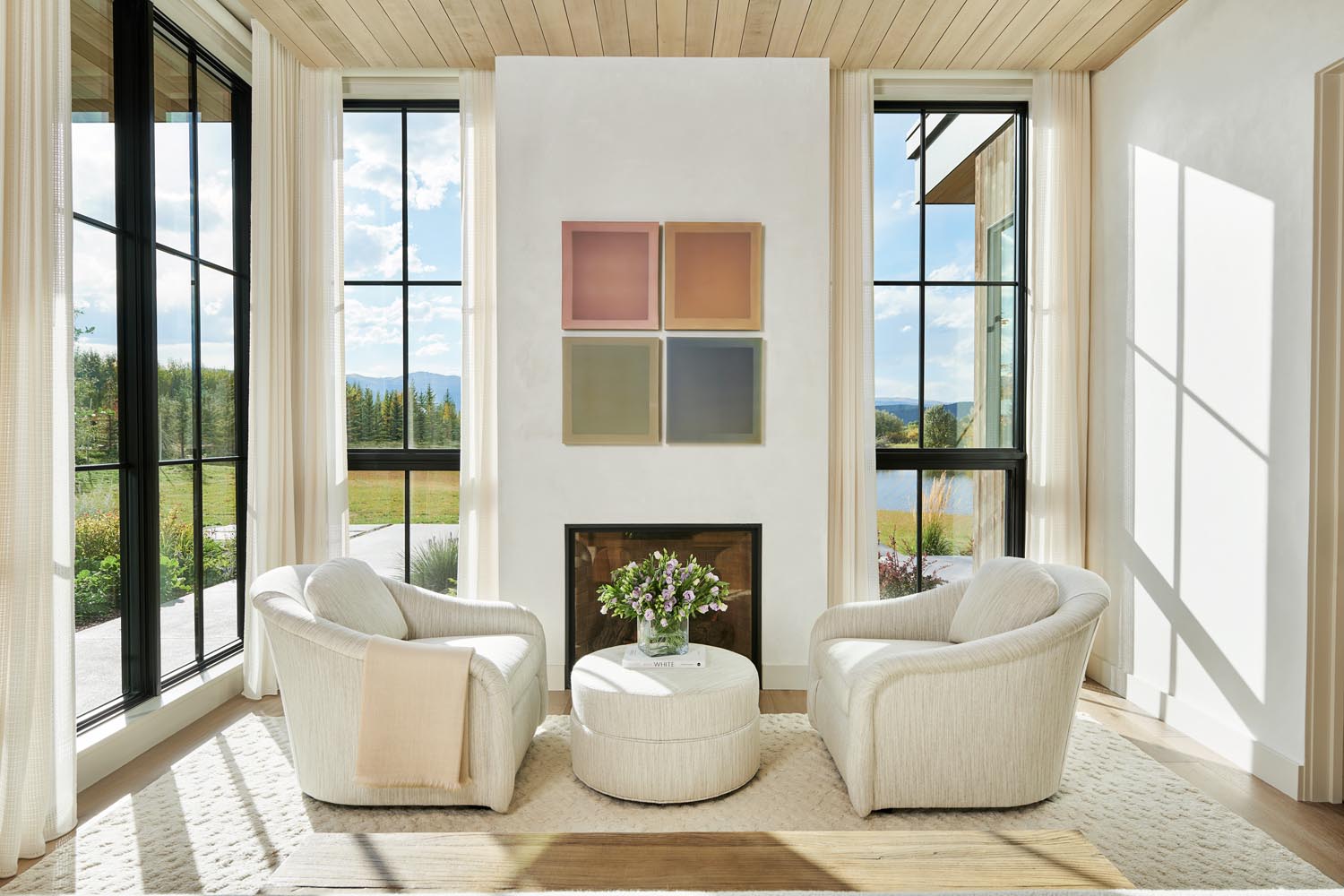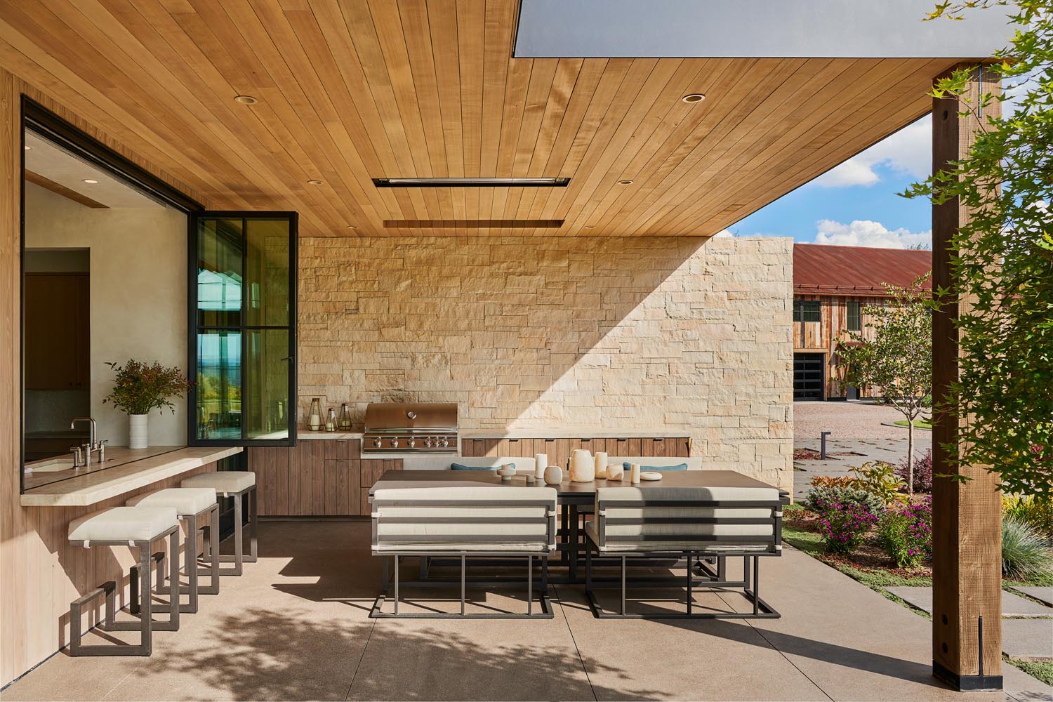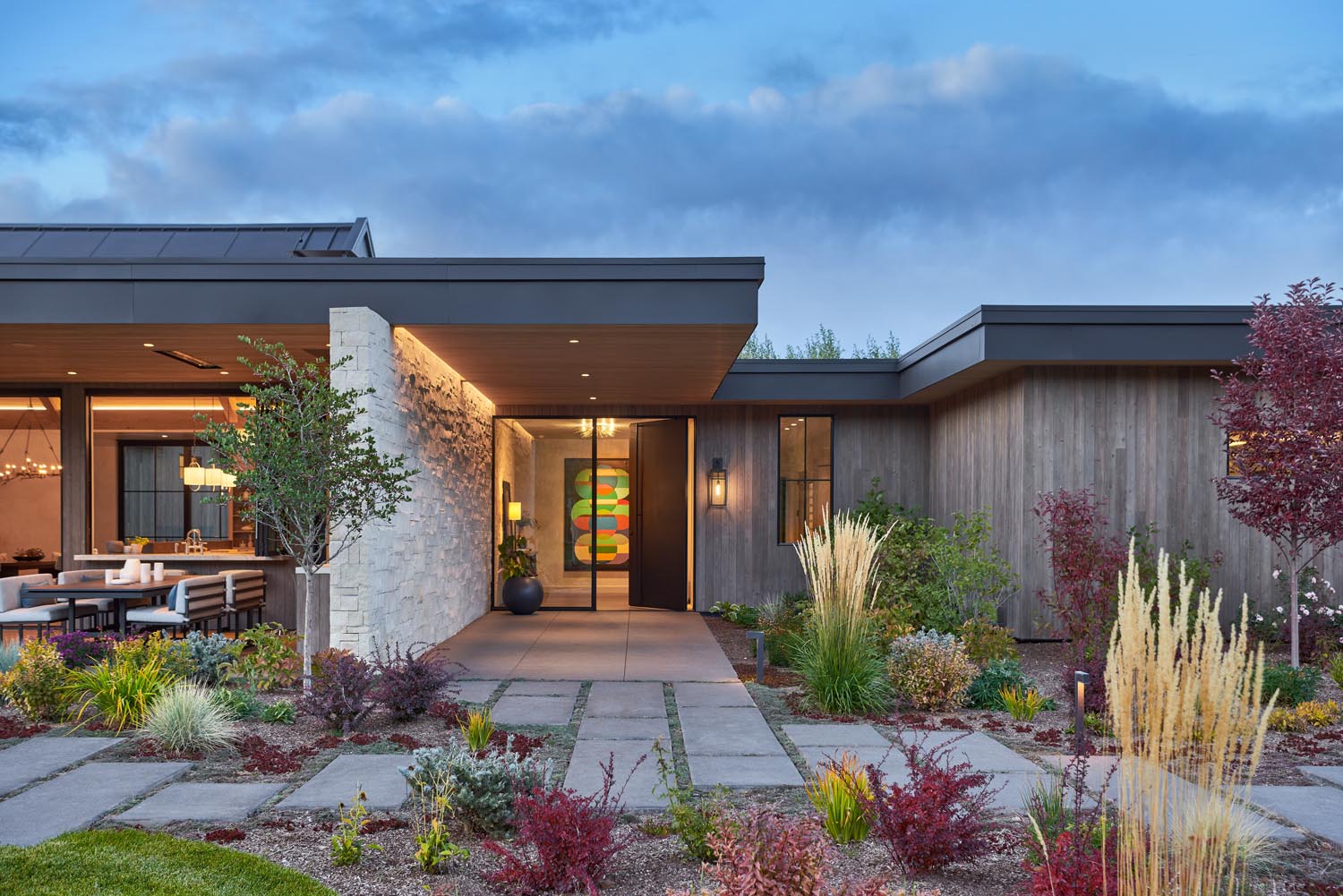 - The home beautifully combines modern and rustic elements, with natural wood and stone showcased throughout. Large, expansive windows and doors seamlessly blend the interior with the exterior, creating a harmonious connection with nature. Inside, reclaimed wood barn accents add rustic charm, while small pops of color—such as blue sofas, green furniture, and green tiles—bring the vibrant outdoors inside.