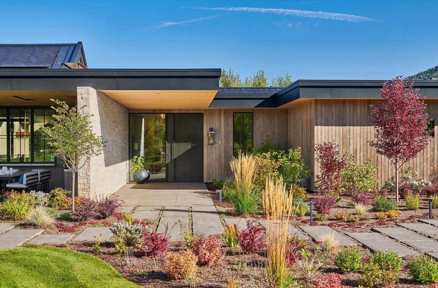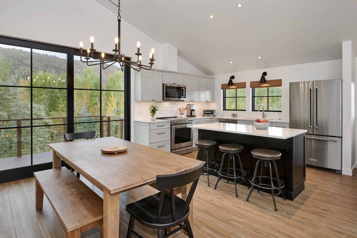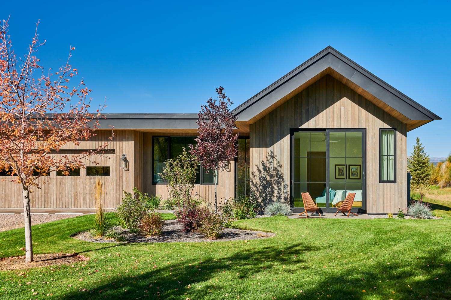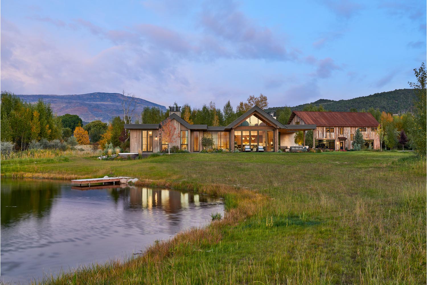 - The home beautifully combines modern and rustic elements, with natural wood and stone showcased throughout. Large, expansive windows and doors seamlessly blend the interior with the exterior, creating a harmonious connection with nature. Inside, reclaimed wood barn accents add rustic charm, while small pops of color—such as blue sofas, green furniture, and green tiles—bring the vibrant outdoors inside.