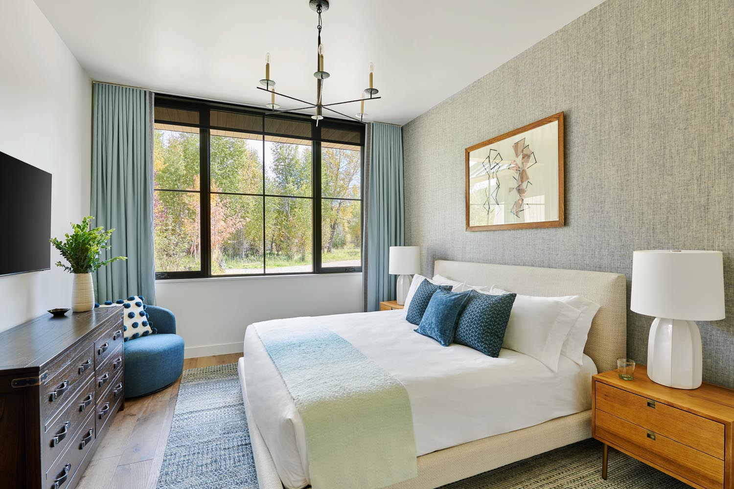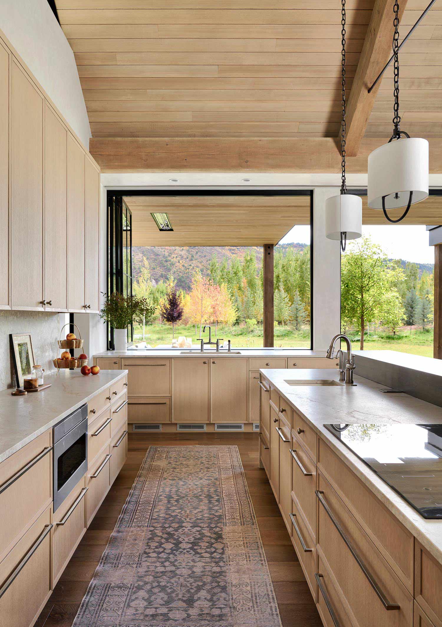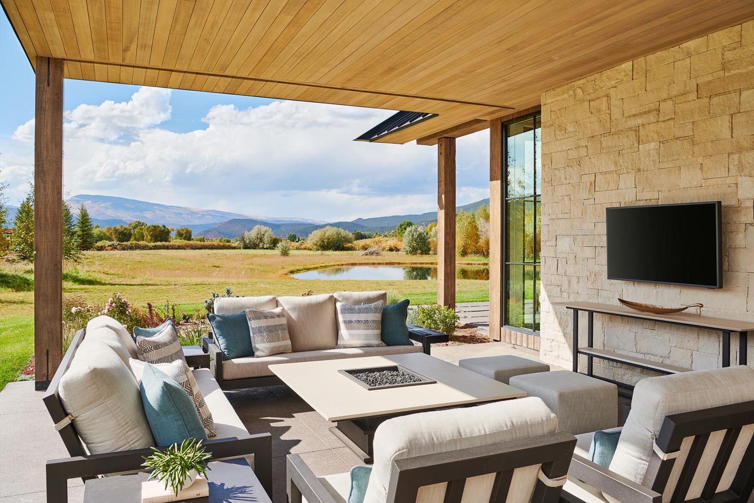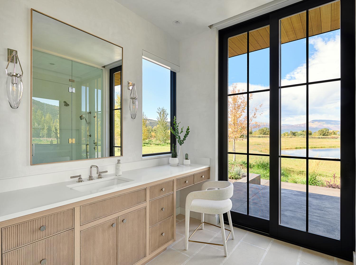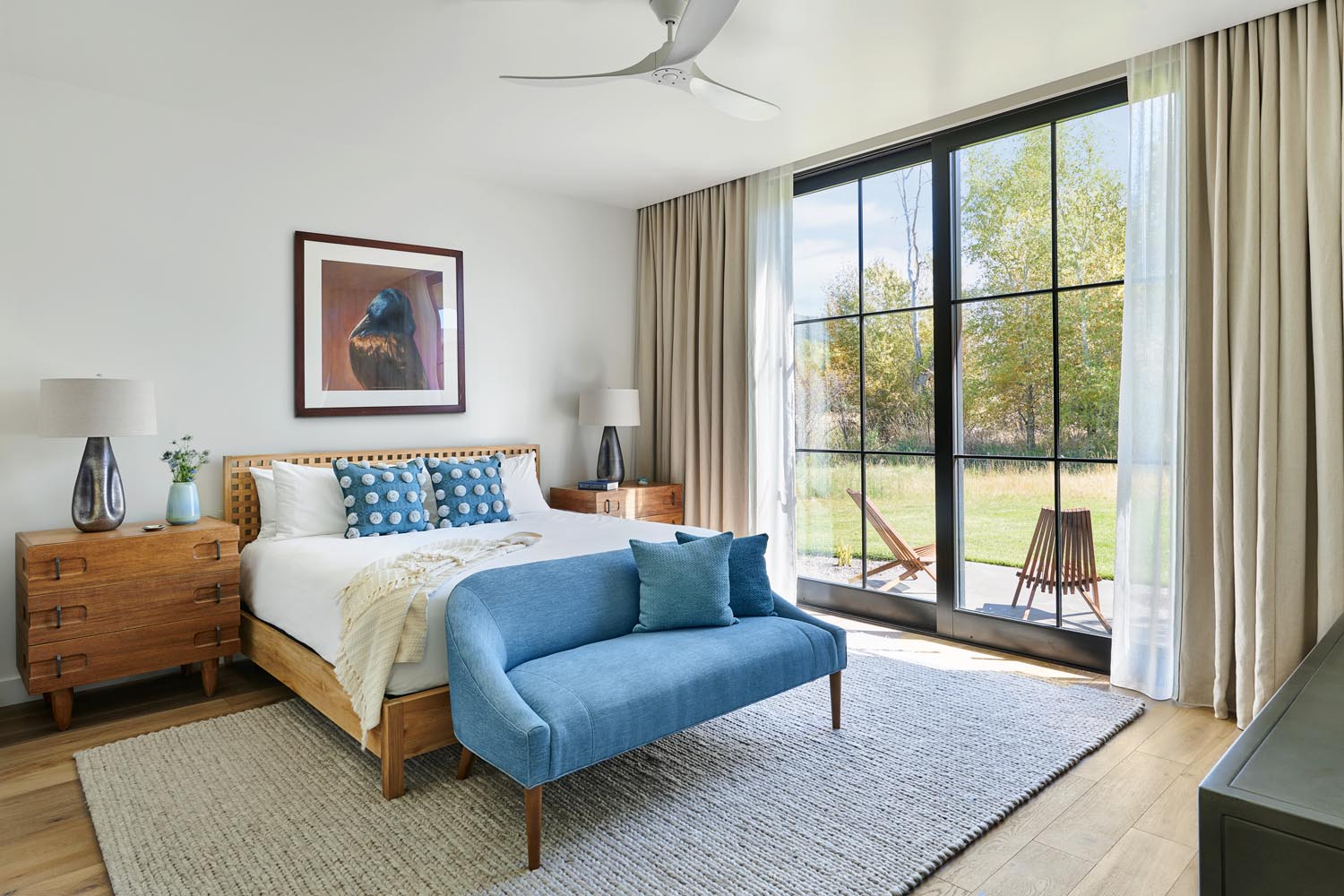 - The home beautifully combines modern and rustic elements, with natural wood and stone showcased throughout. Large, expansive windows and doors seamlessly blend the interior with the exterior, creating a harmonious connection with nature. Inside, reclaimed wood barn accents add rustic charm, while small pops of color—such as blue sofas, green furniture, and green tiles—bring the vibrant outdoors inside.