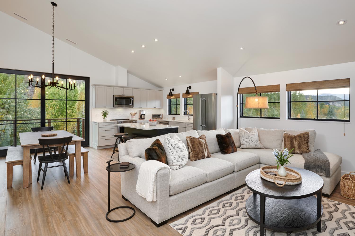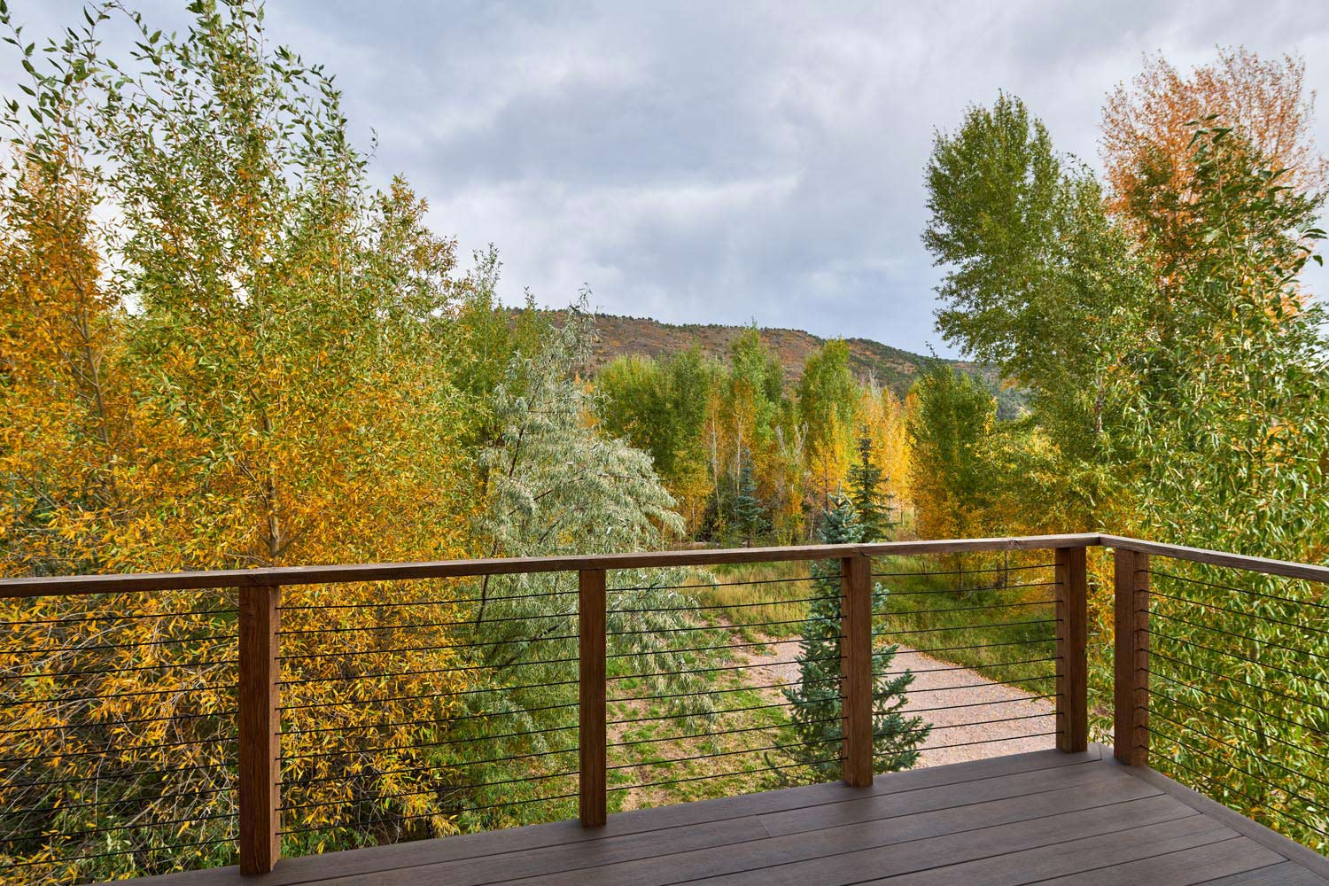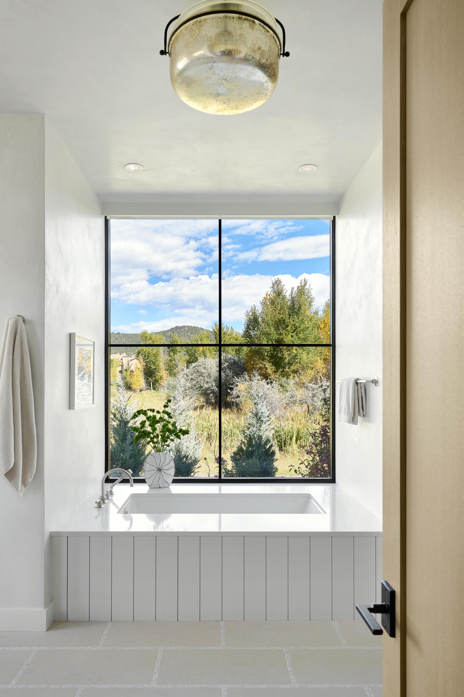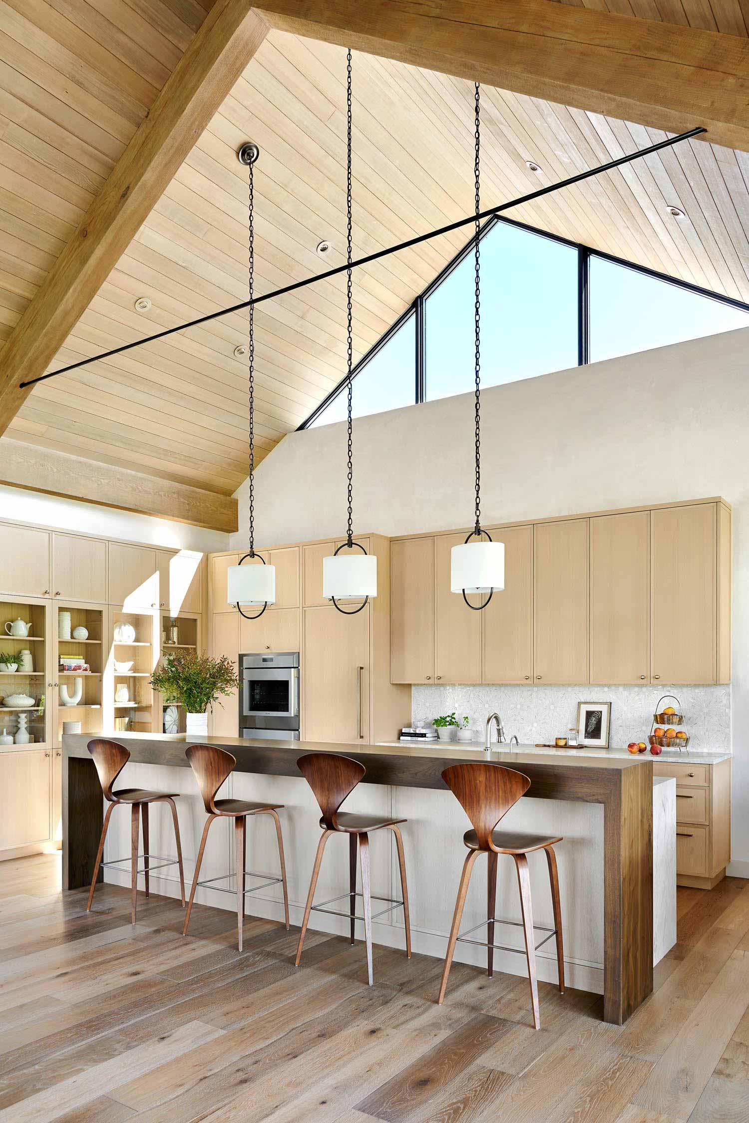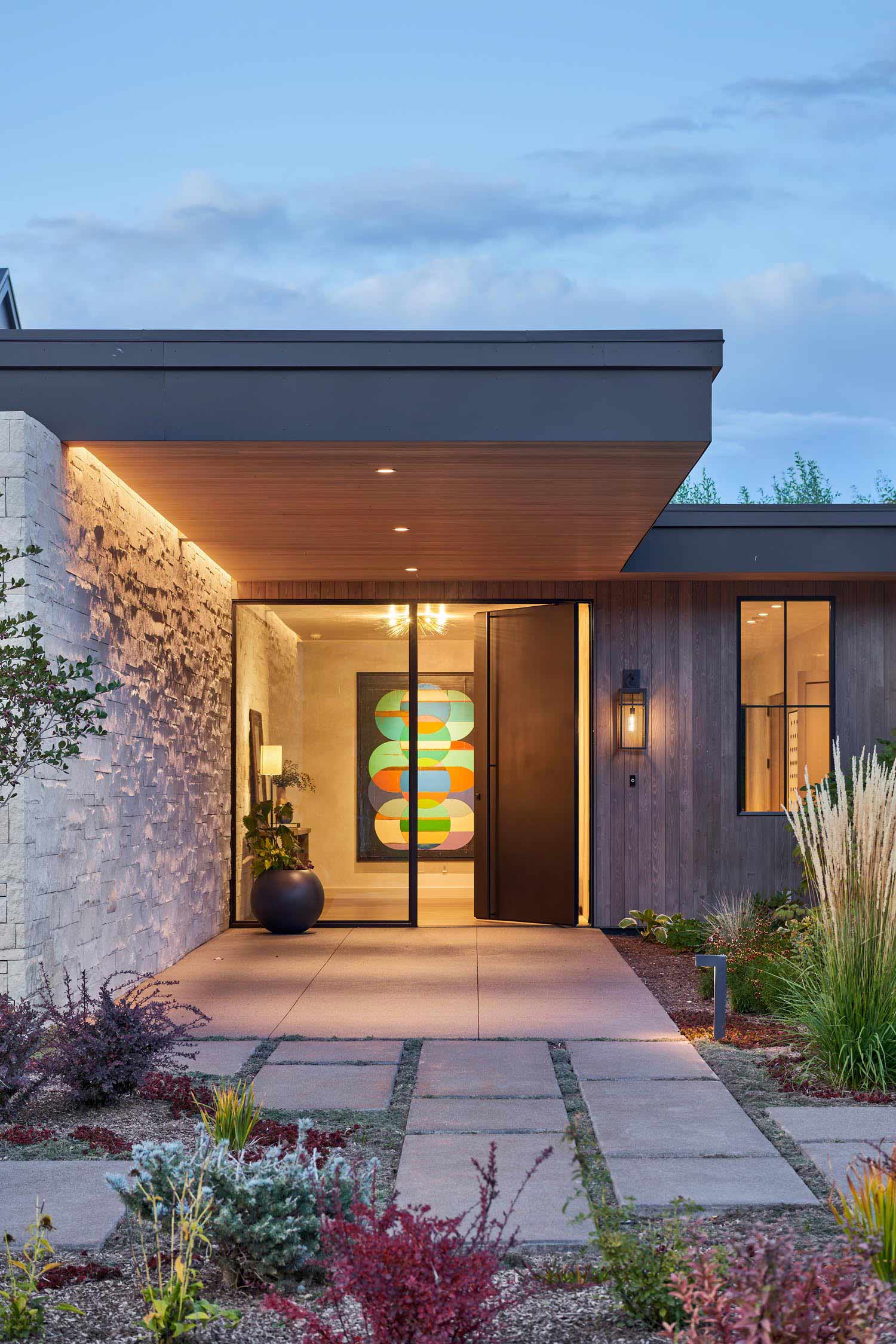 - The home beautifully combines modern and rustic elements, with natural wood and stone showcased throughout. Large, expansive windows and doors seamlessly blend the interior with the exterior, creating a harmonious connection with nature. Inside, reclaimed wood barn accents add rustic charm, while small pops of color—such as blue sofas, green furniture, and green tiles—bring the vibrant outdoors inside.