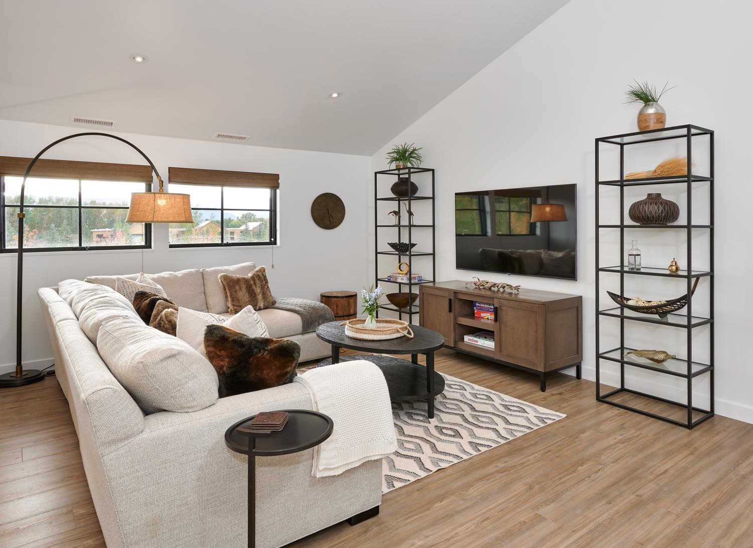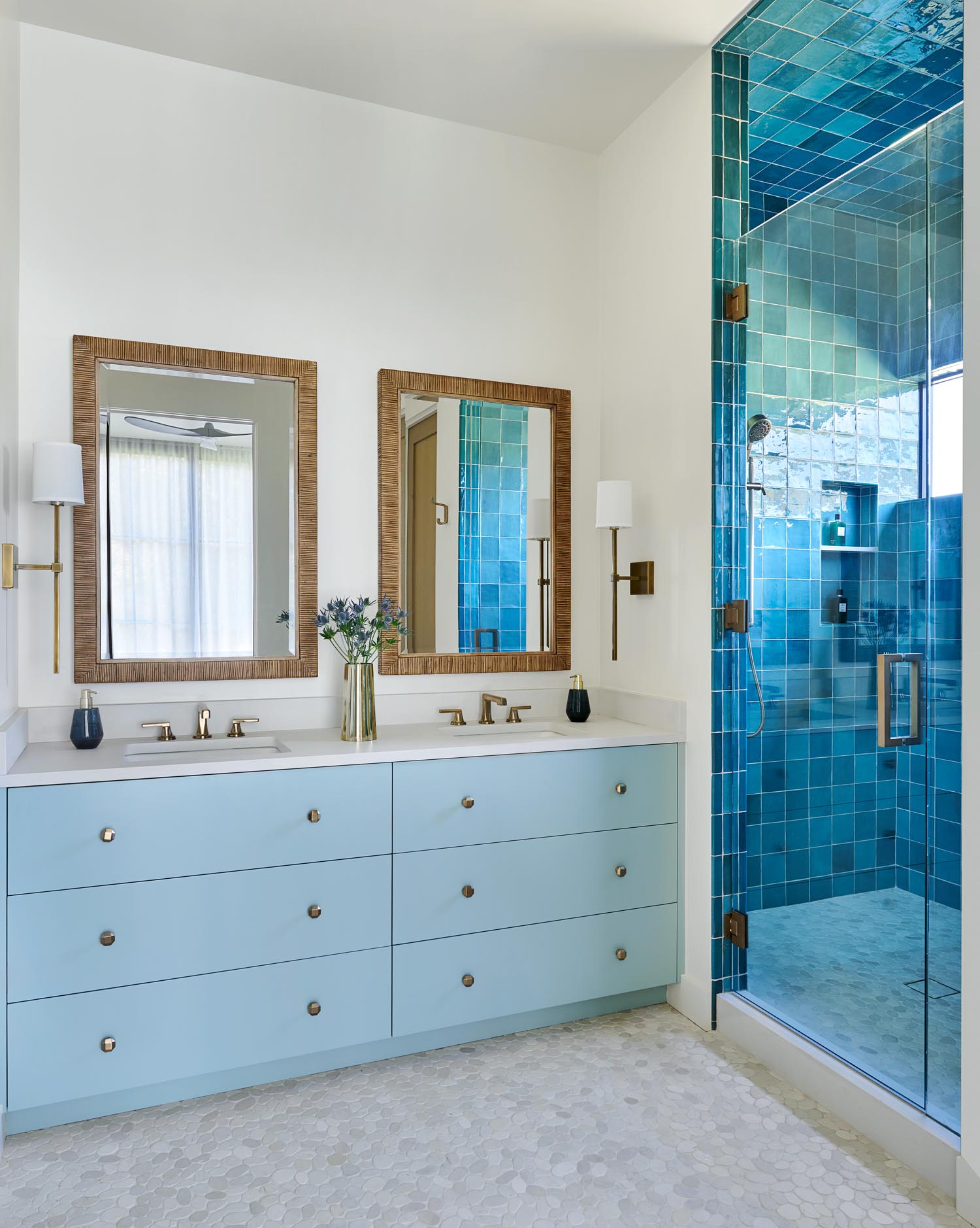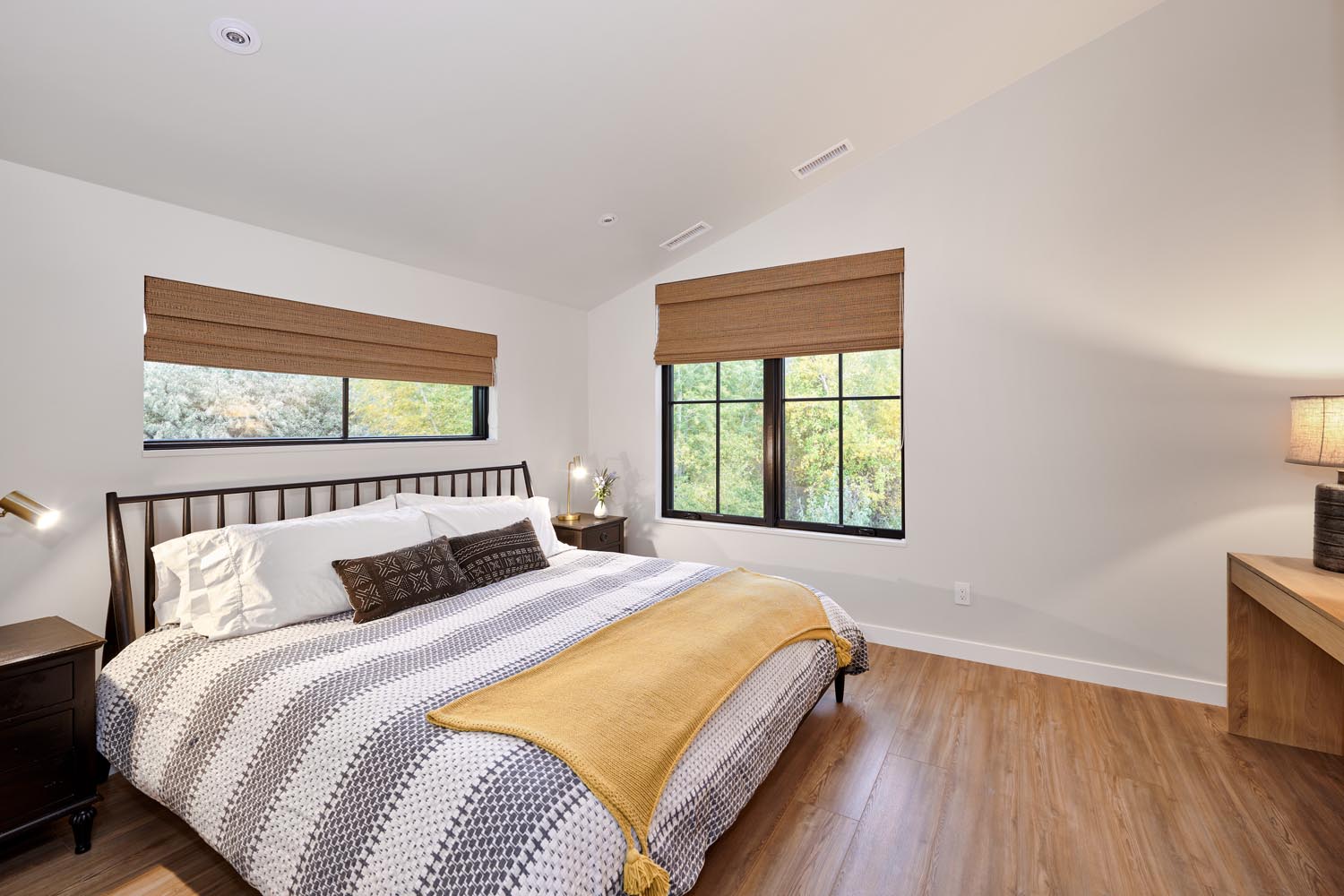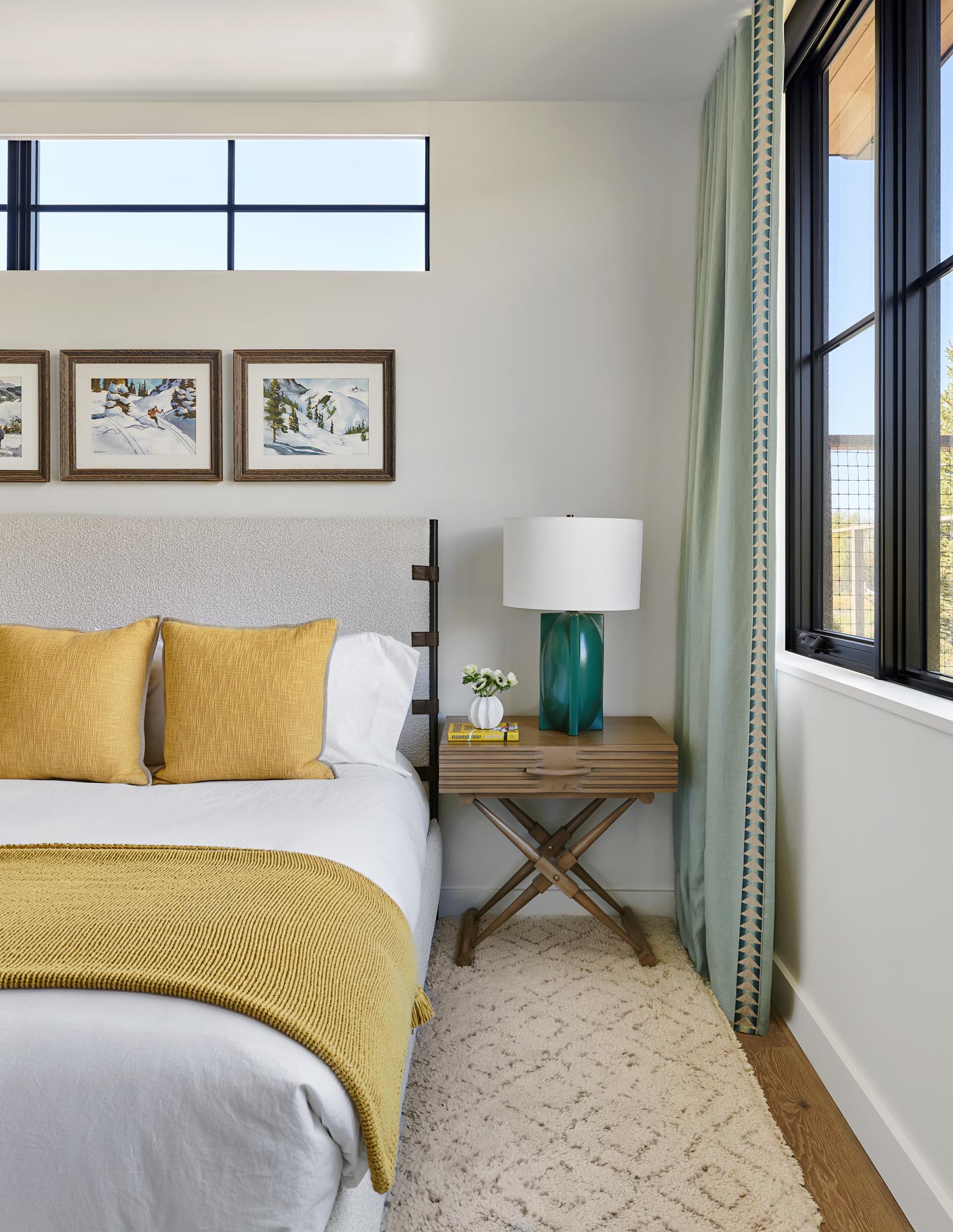 - The home beautifully combines modern and rustic elements, with natural wood and stone showcased throughout. Large, expansive windows and doors seamlessly blend the interior with the exterior, creating a harmonious connection with nature. Inside, reclaimed wood barn accents add rustic charm, while small pops of color—such as blue sofas, green furniture, and green tiles—bring the vibrant outdoors inside.