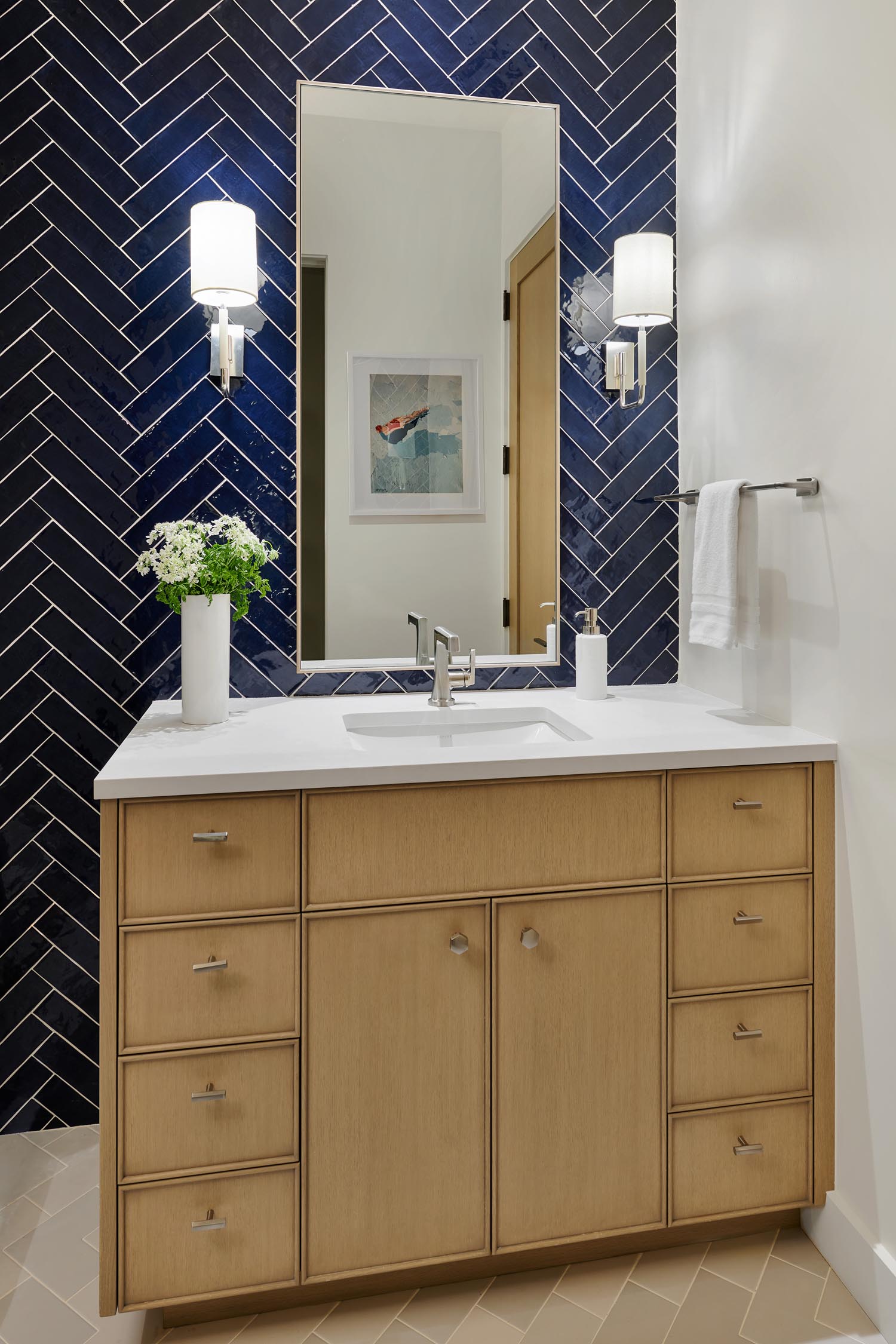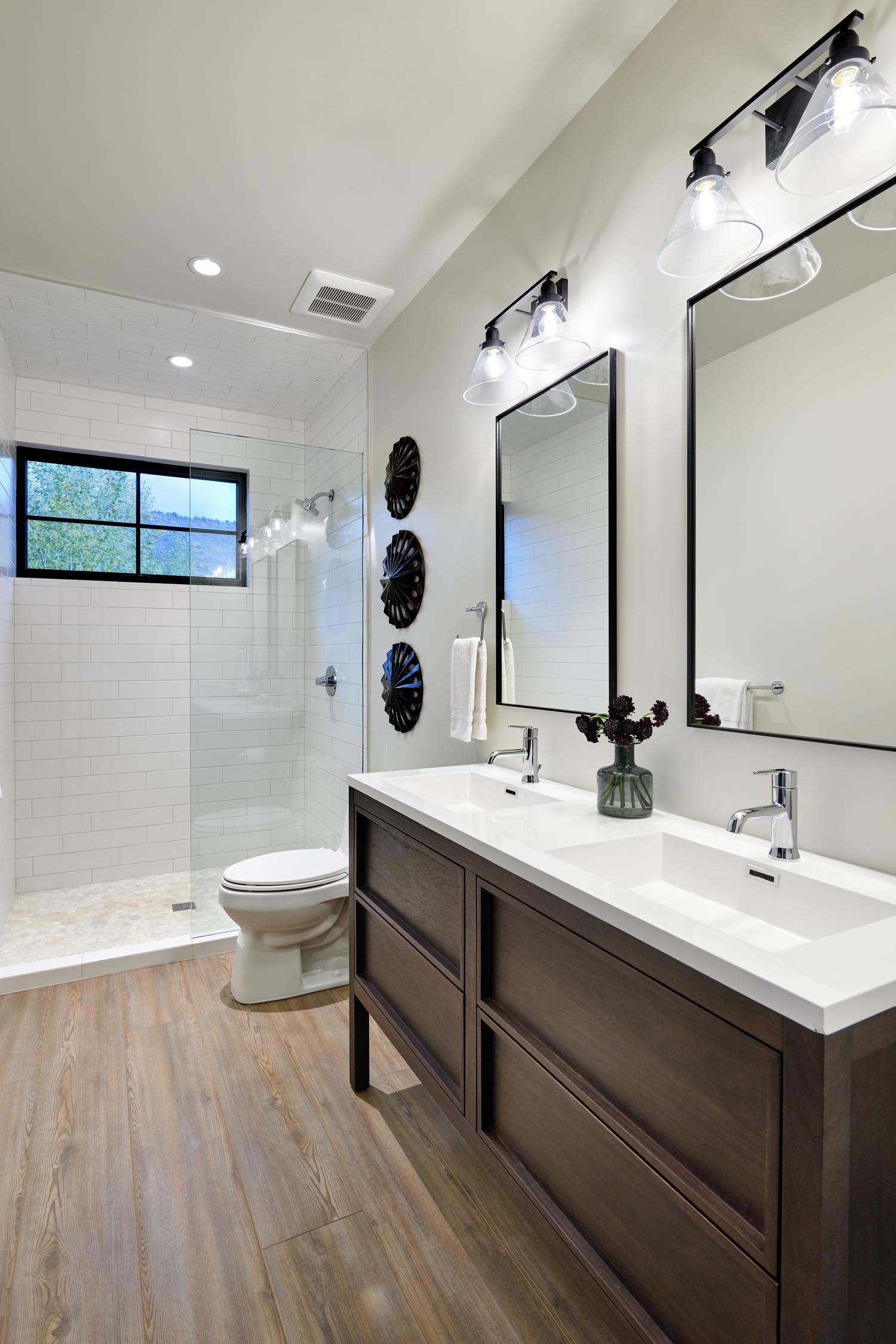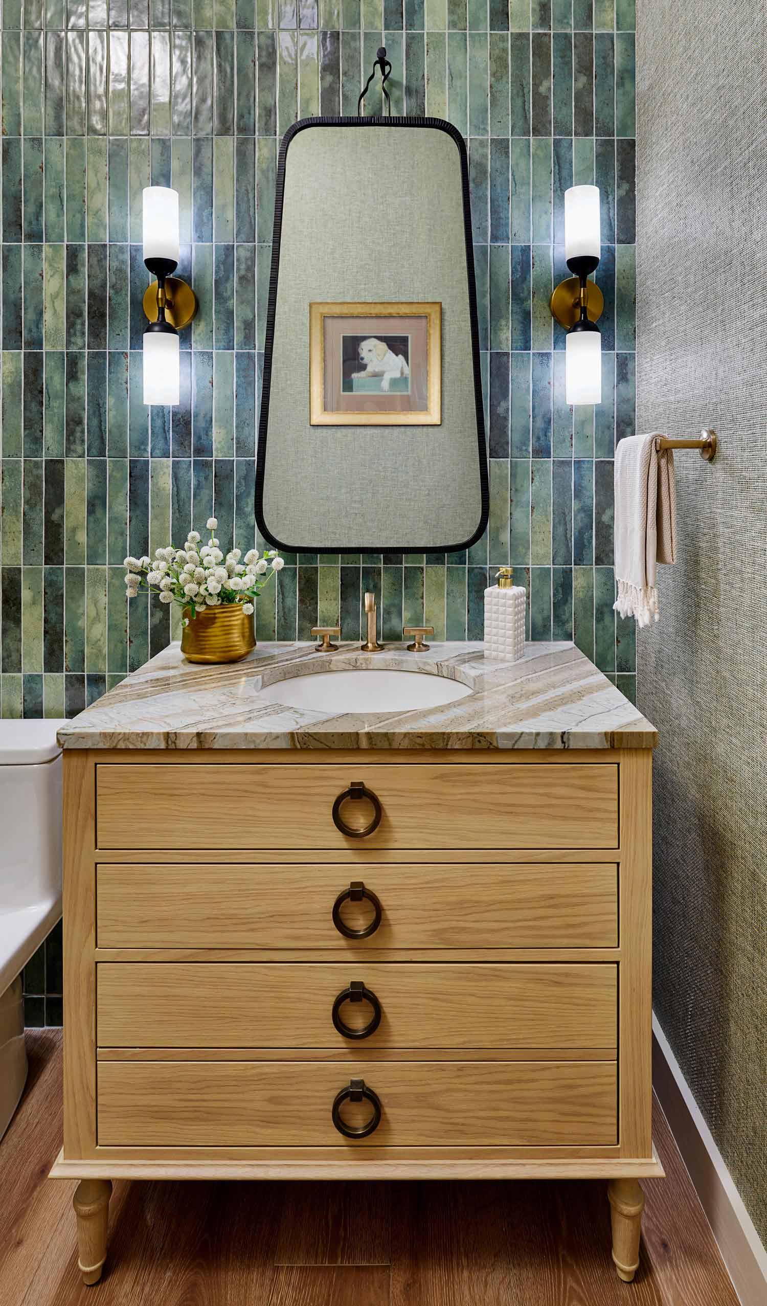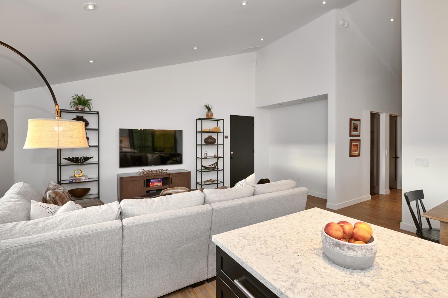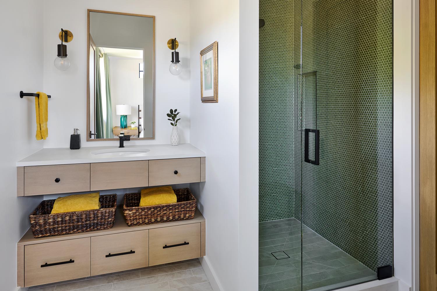 - The home beautifully combines modern and rustic elements, with natural wood and stone showcased throughout. Large, expansive windows and doors seamlessly blend the interior with the exterior, creating a harmonious connection with nature. Inside, reclaimed wood barn accents add rustic charm, while small pops of color—such as blue sofas, green furniture, and green tiles—bring the vibrant outdoors inside.