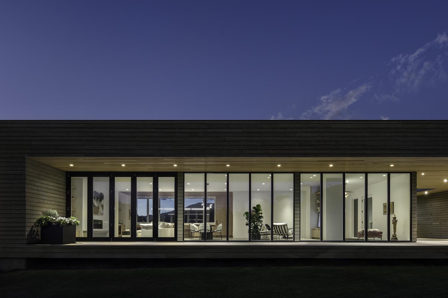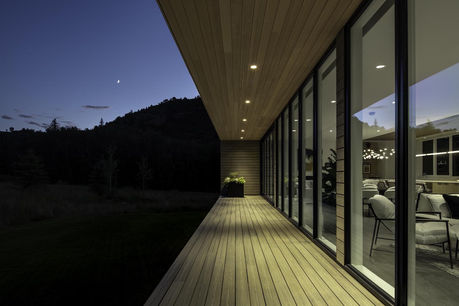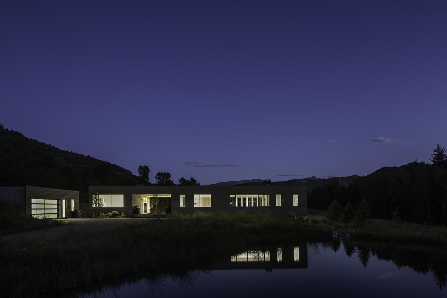 A waterfront view of a home at night