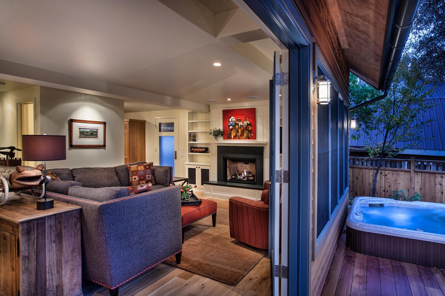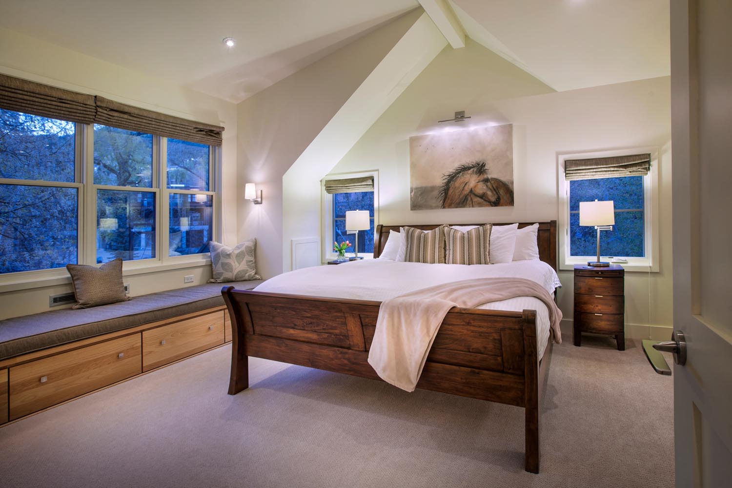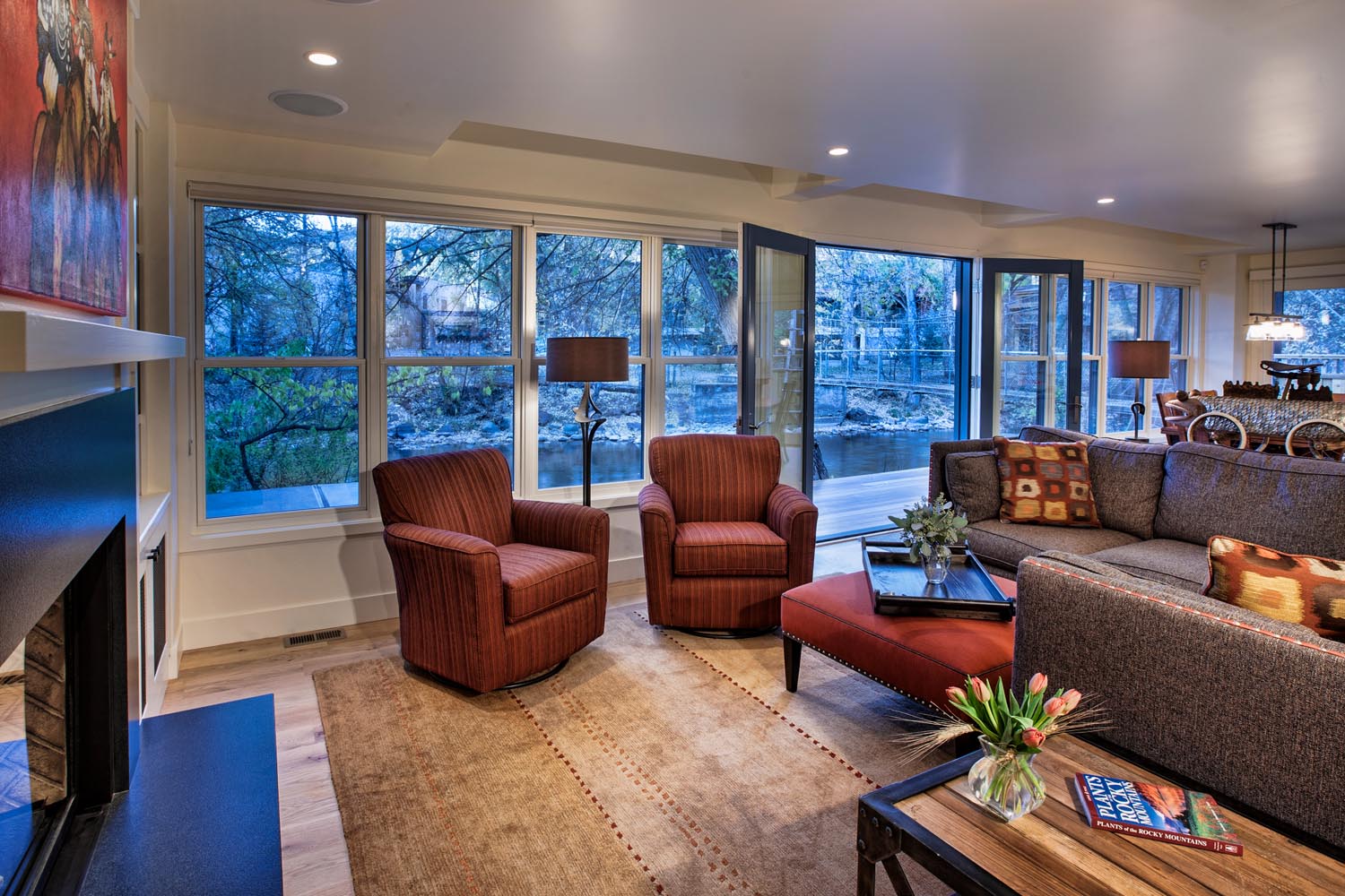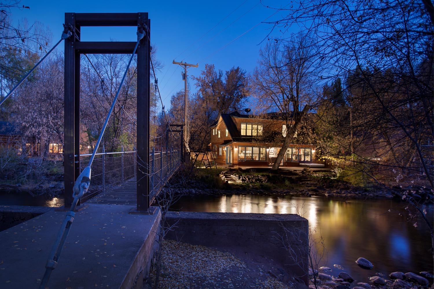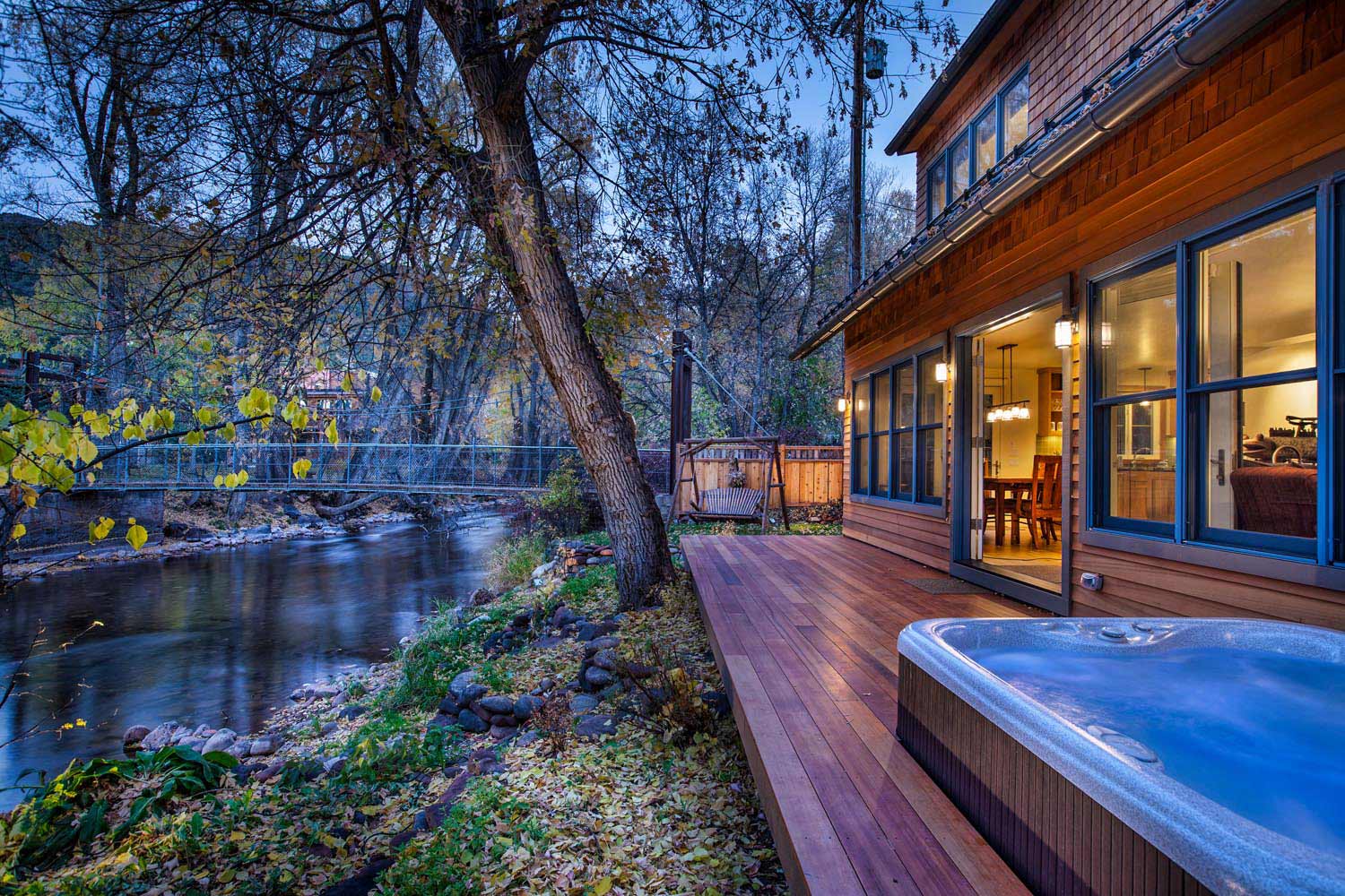 - This stunning riverside retreat on the banks of the Frying Pan River, adjacent to the Swinging Bridge, epitomizes Traditional style with its 3,000 sq. ft. of elegantly crafted space. The wood exterior, accentuated by distinctive blue window frames, creates a charming and inviting facade. Inside, the home exudes warmth and comfort with abundant wood furniture and flooring, harmoniously balanced by natural colors. The white walls enhance the sense of space and light, while the light green kitchen backsplash adds a refreshing touch. Recessed lighting subtly illuminates each room, creating a cozy and serene ambiance that blends seamlessly with the natural surroundings.