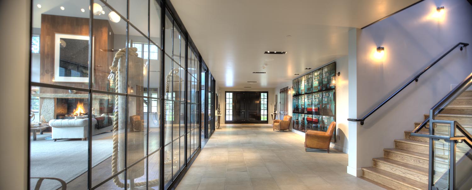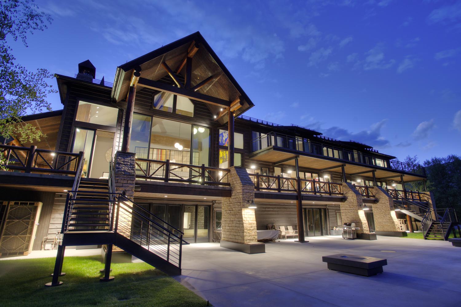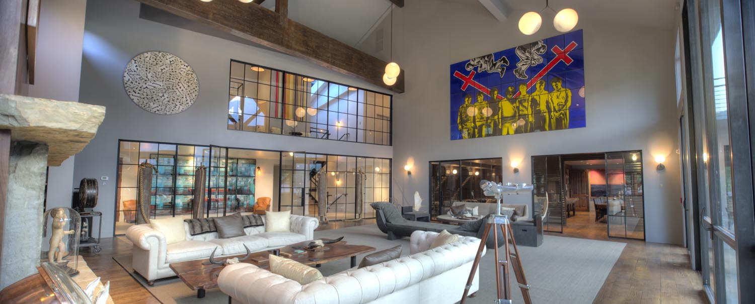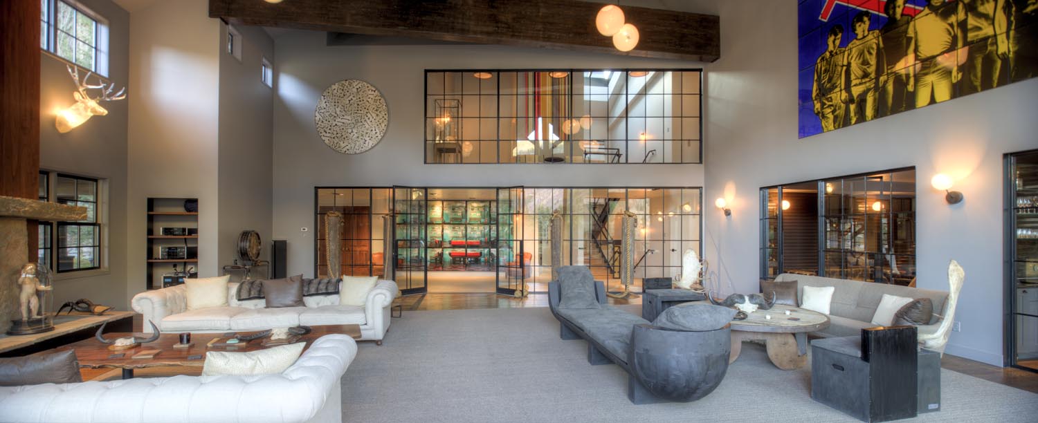 - The Mountain Contemporary home is a spectacular 18,000 sq. ft. river-side residence that marries European influences with modern design. Its angular exterior and vaulted ceilings create a dramatic visual impact, complemented by a large wrap-around deck and a huge glass pane from the second floor overlooking the first. Inside, refined simplicity prevails with hidden kitchen elements and a palette of natural colors like cream, gray, and brown, creating an elegant yet understated ambiance.