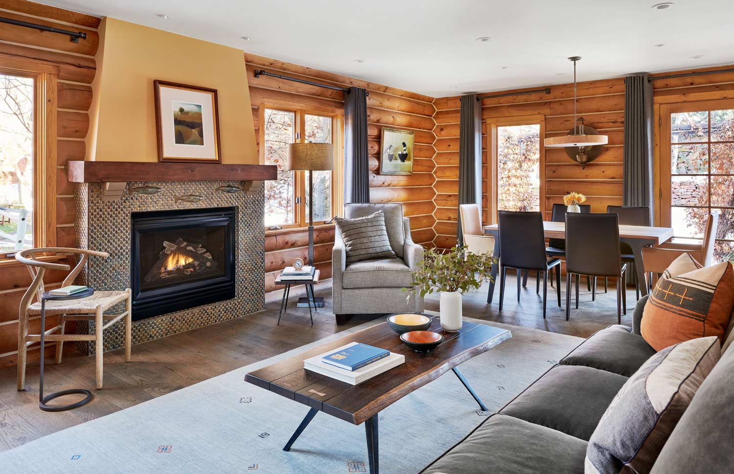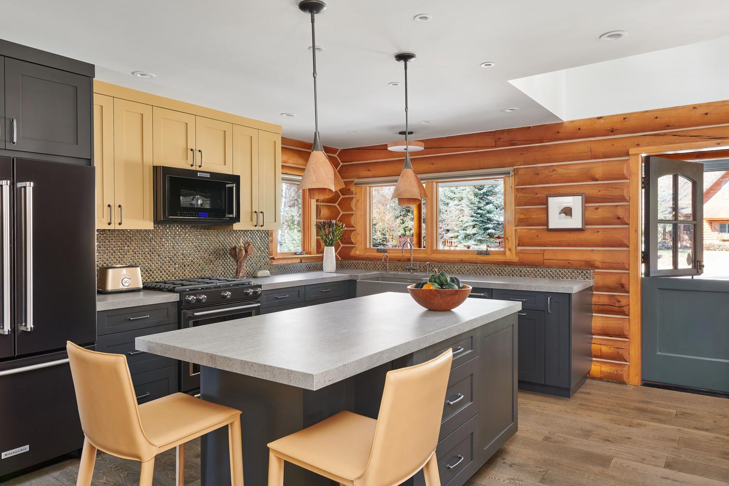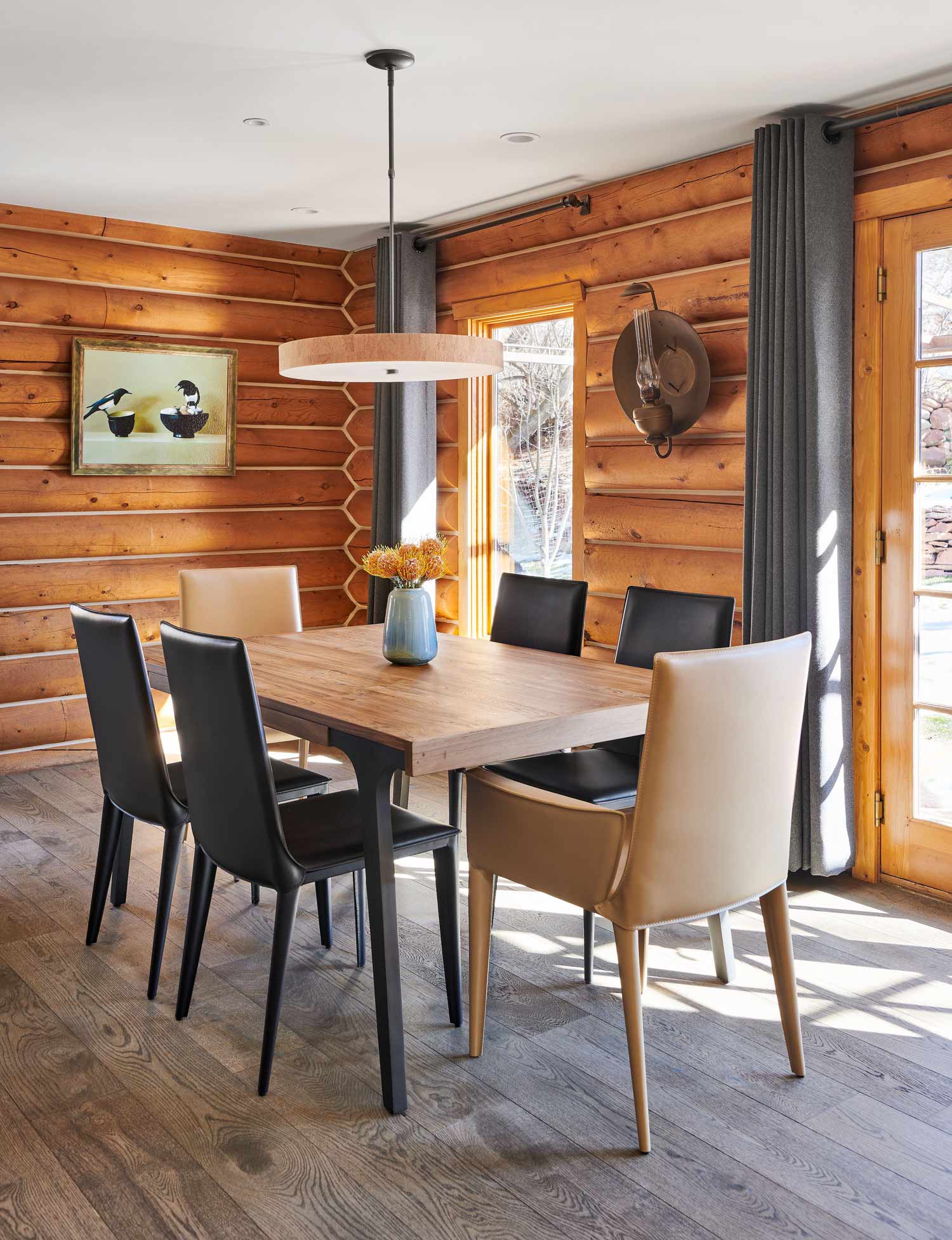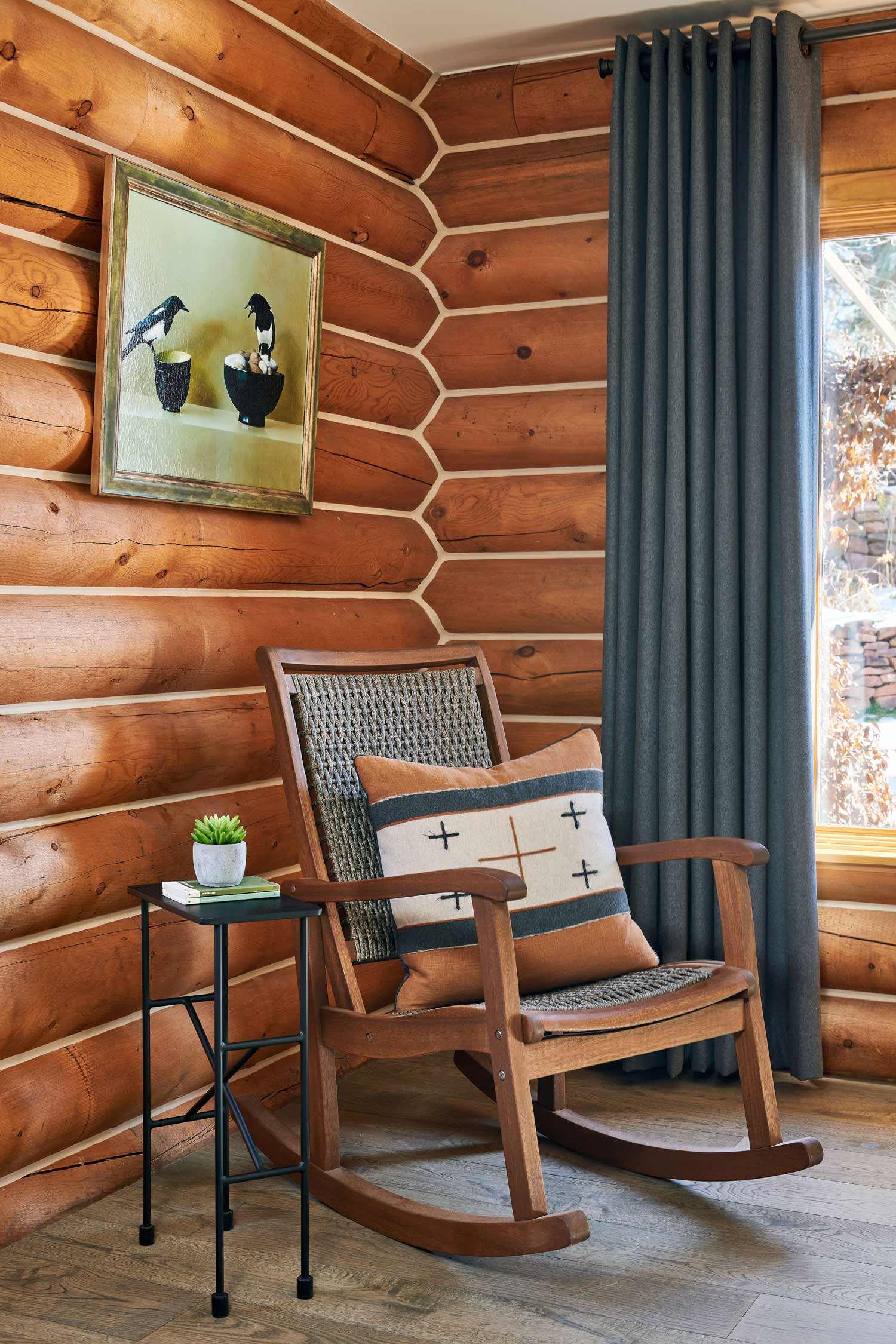 - This welcoming home seamlessly blends rustic charm with modern comfort, featuring intermittent exposed log cabin interiors that evoke a sense of coziness and warmth. The white walls provide a bright and airy backdrop, while light wood and heather gray/blue cabinets add a touch of contemporary flair to the space. Throughout the home, repeated hints of blue accents create a cohesive and calming atmosphere. With its minimal yet artful design, this residence embodies a perfect balance of rustic coziness and modern sophistication, offering a welcoming retreat for its inhabitants.