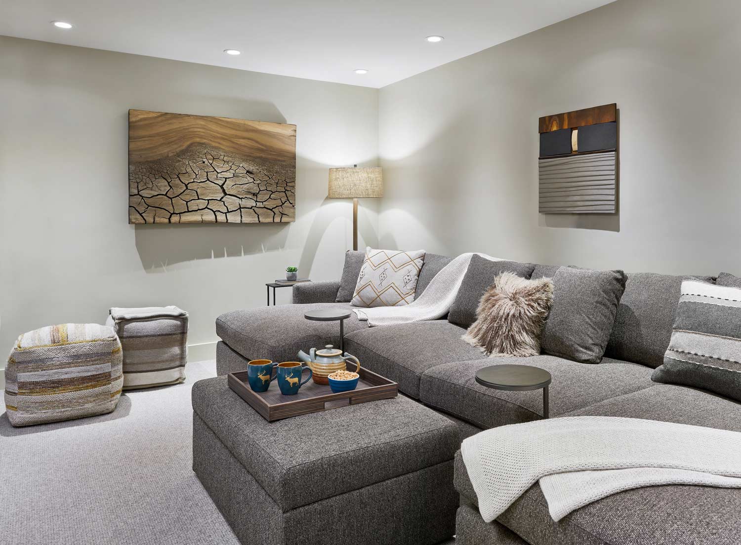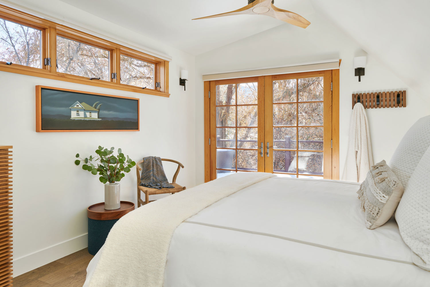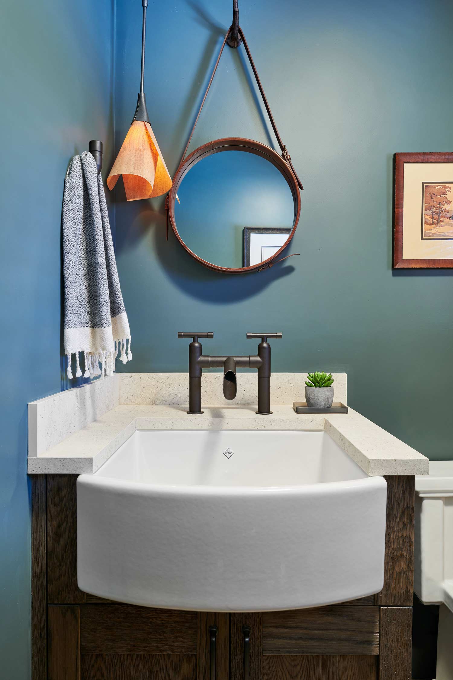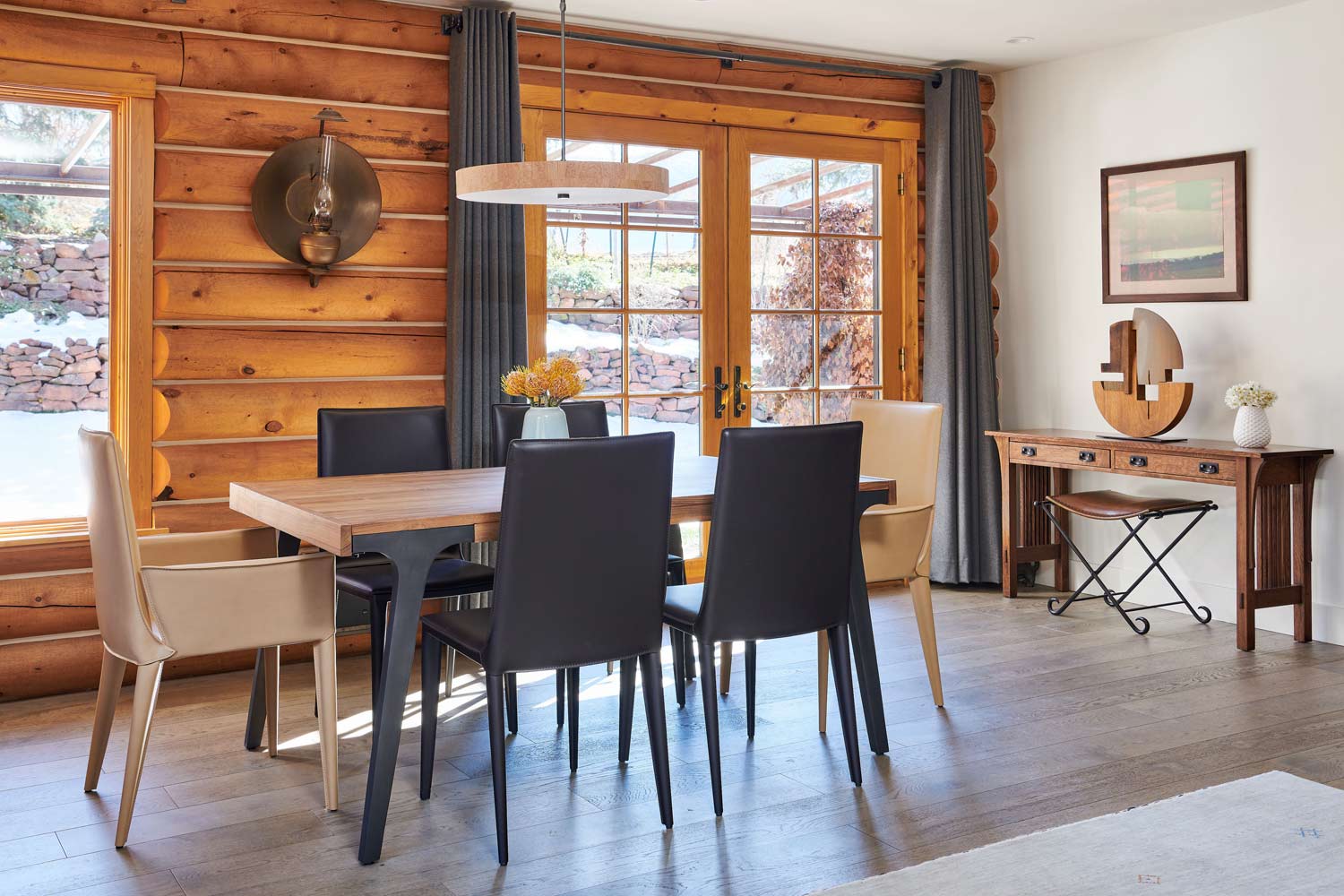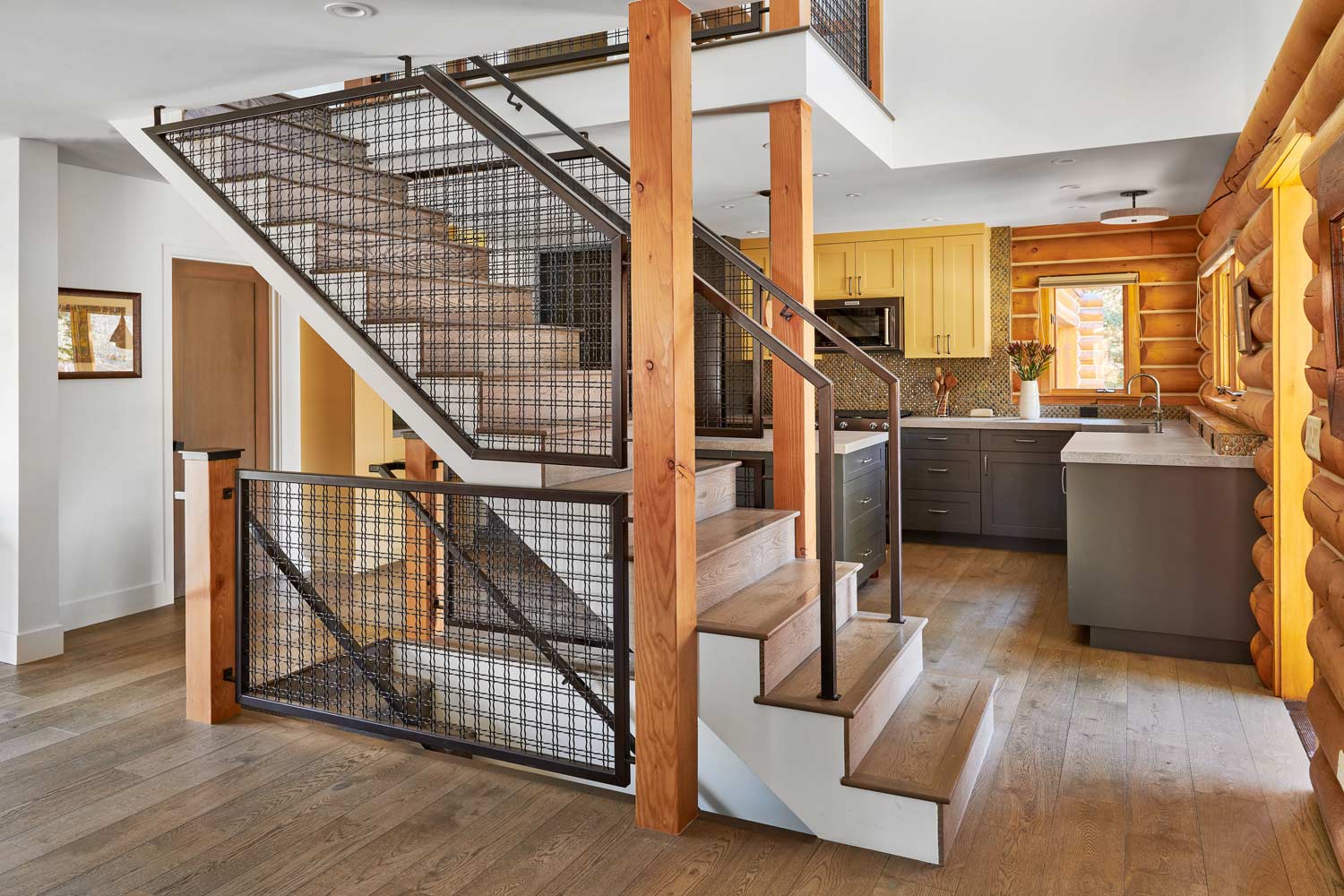 - This welcoming home seamlessly blends rustic charm with modern comfort, featuring intermittent exposed log cabin interiors that evoke a sense of coziness and warmth. The white walls provide a bright and airy backdrop, while light wood and heather gray/blue cabinets add a touch of contemporary flair to the space. Throughout the home, repeated hints of blue accents create a cohesive and calming atmosphere. With its minimal yet artful design, this residence embodies a perfect balance of rustic coziness and modern sophistication, offering a welcoming retreat for its inhabitants.